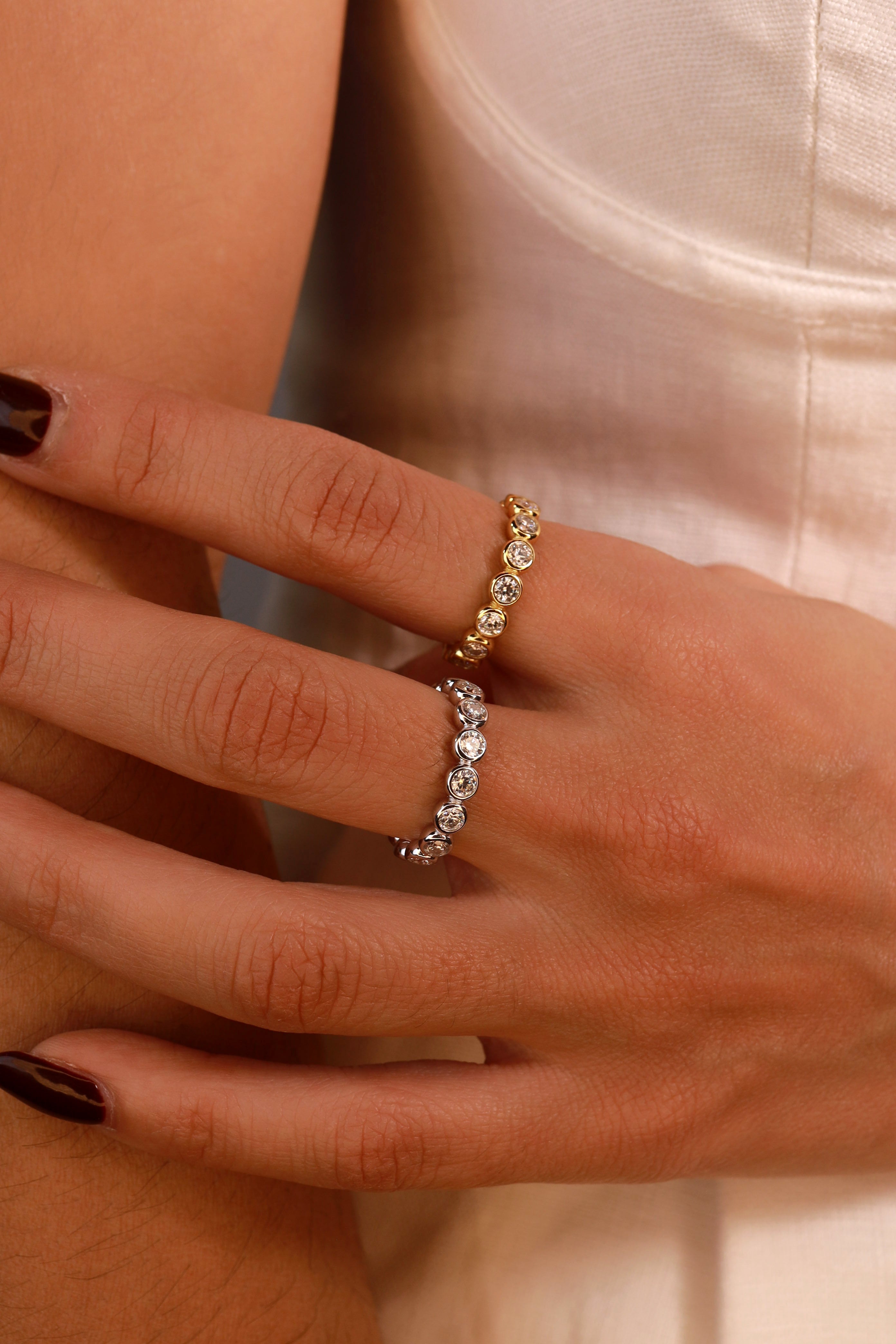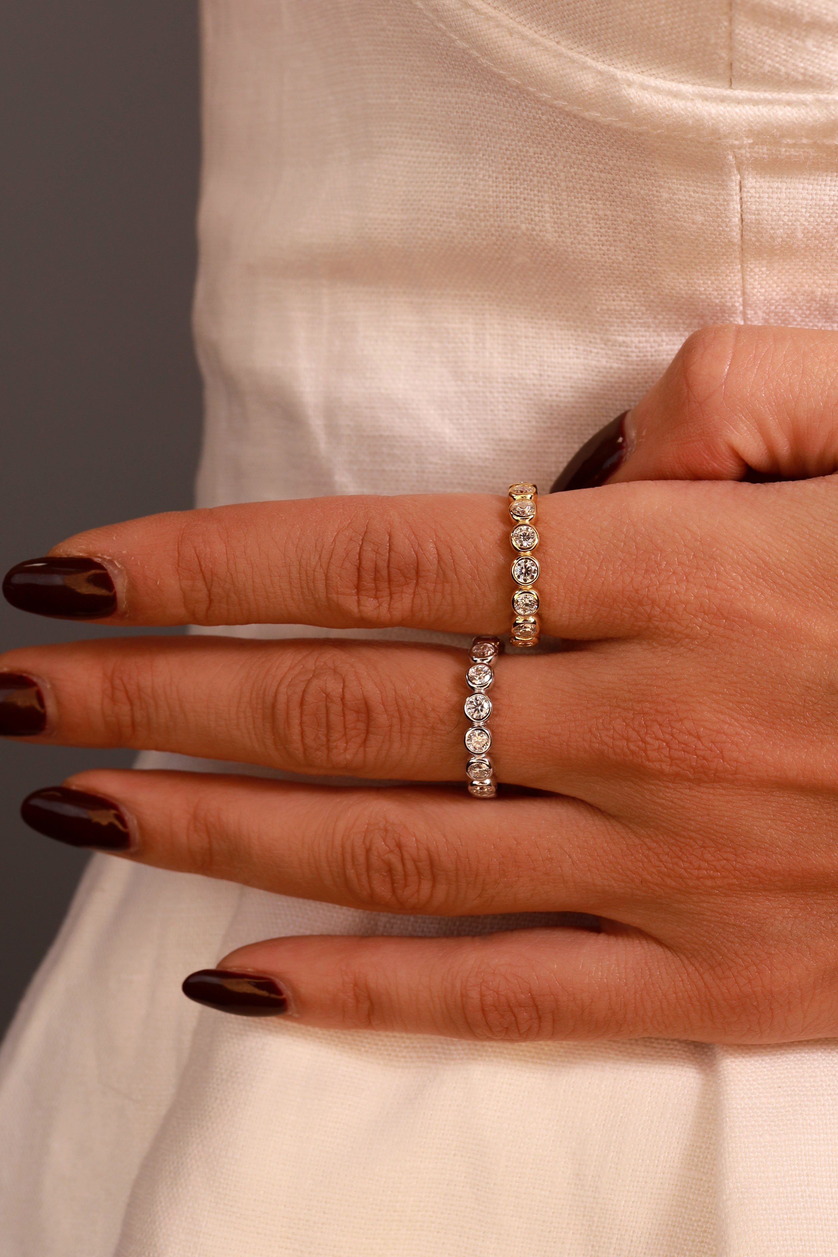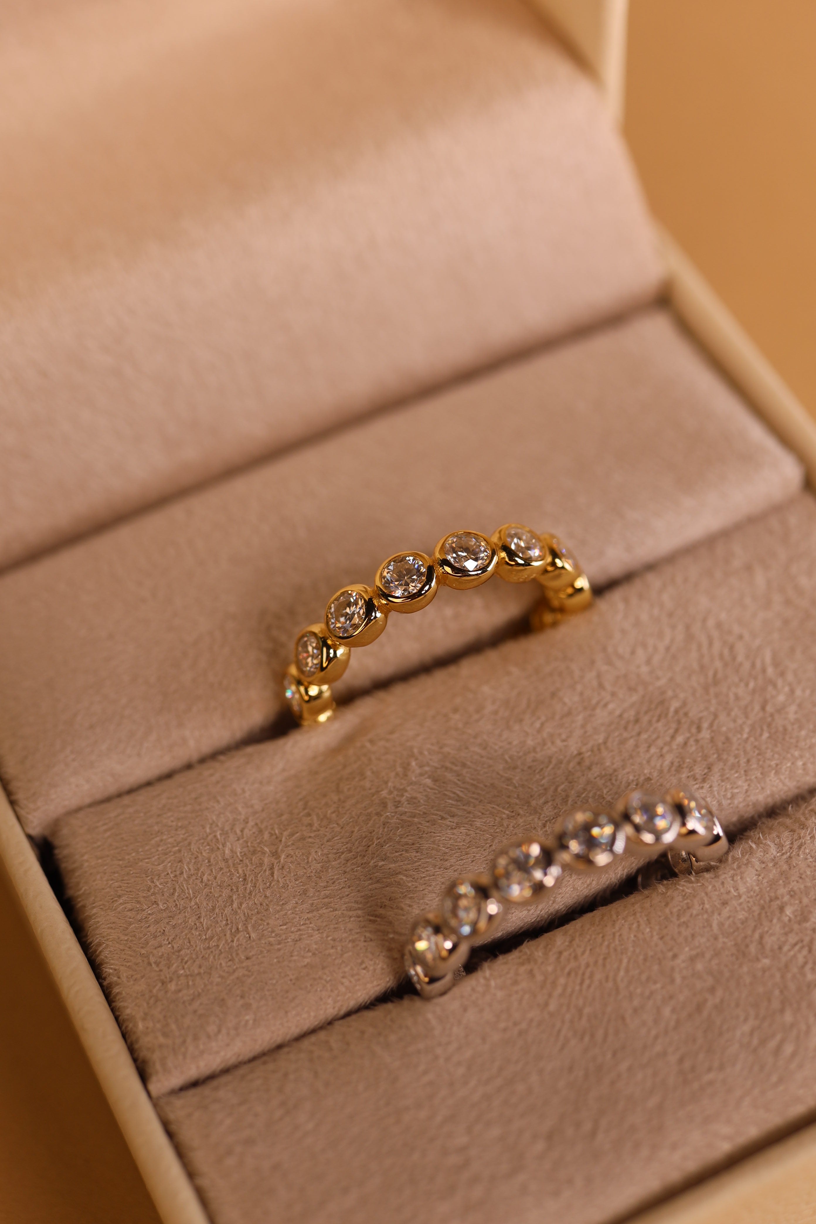 Embrace timeless elegance with The Effortless Ring, a captivating piece designed for those who appreciate understated luxury. This ring features a continuous circle of brilliant moissanite stones, each set in a sleek bezel for a refined yet modern look. Available in gold or silver, this ring is perfect for adding a touch of effortless glamour to any ensemble.