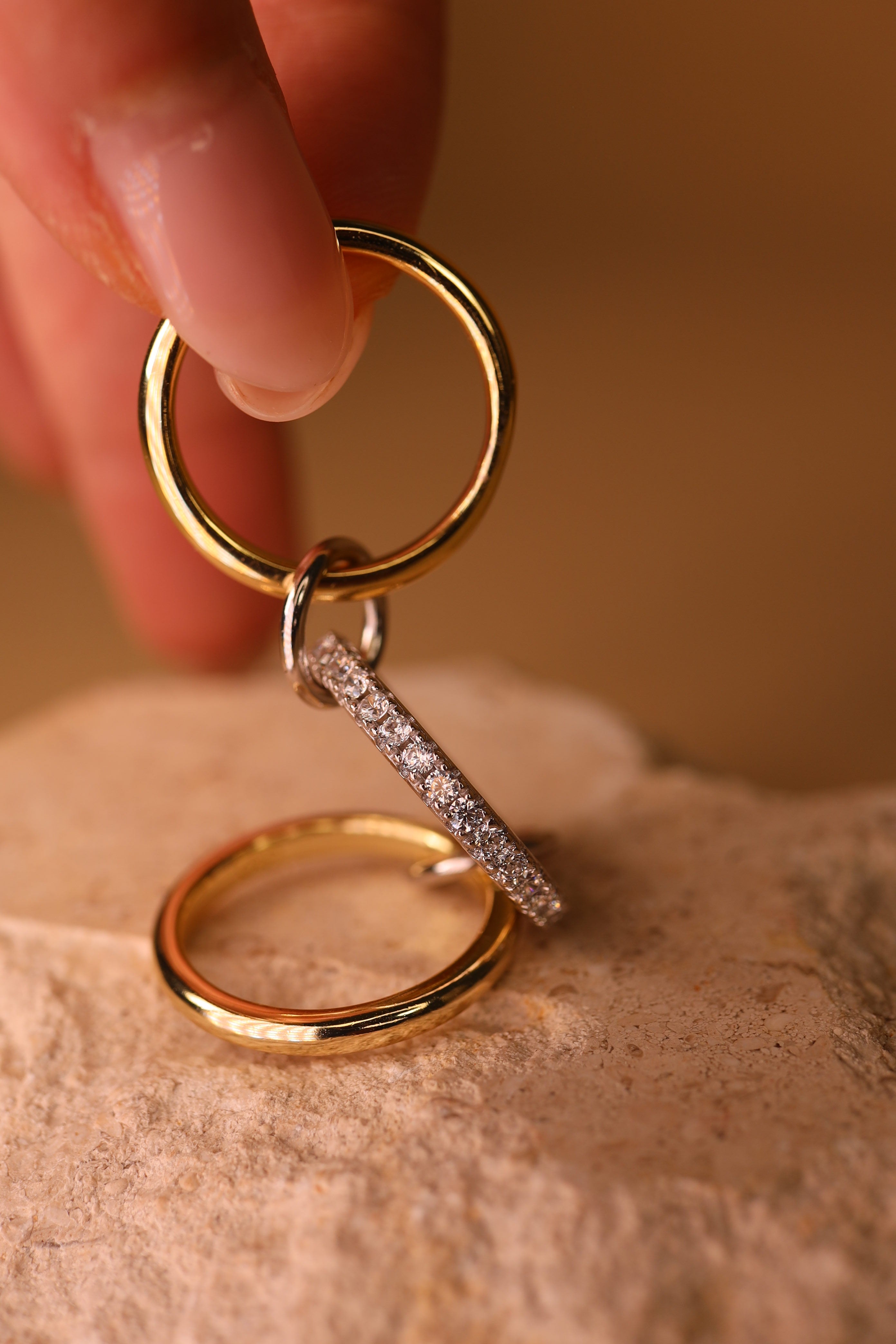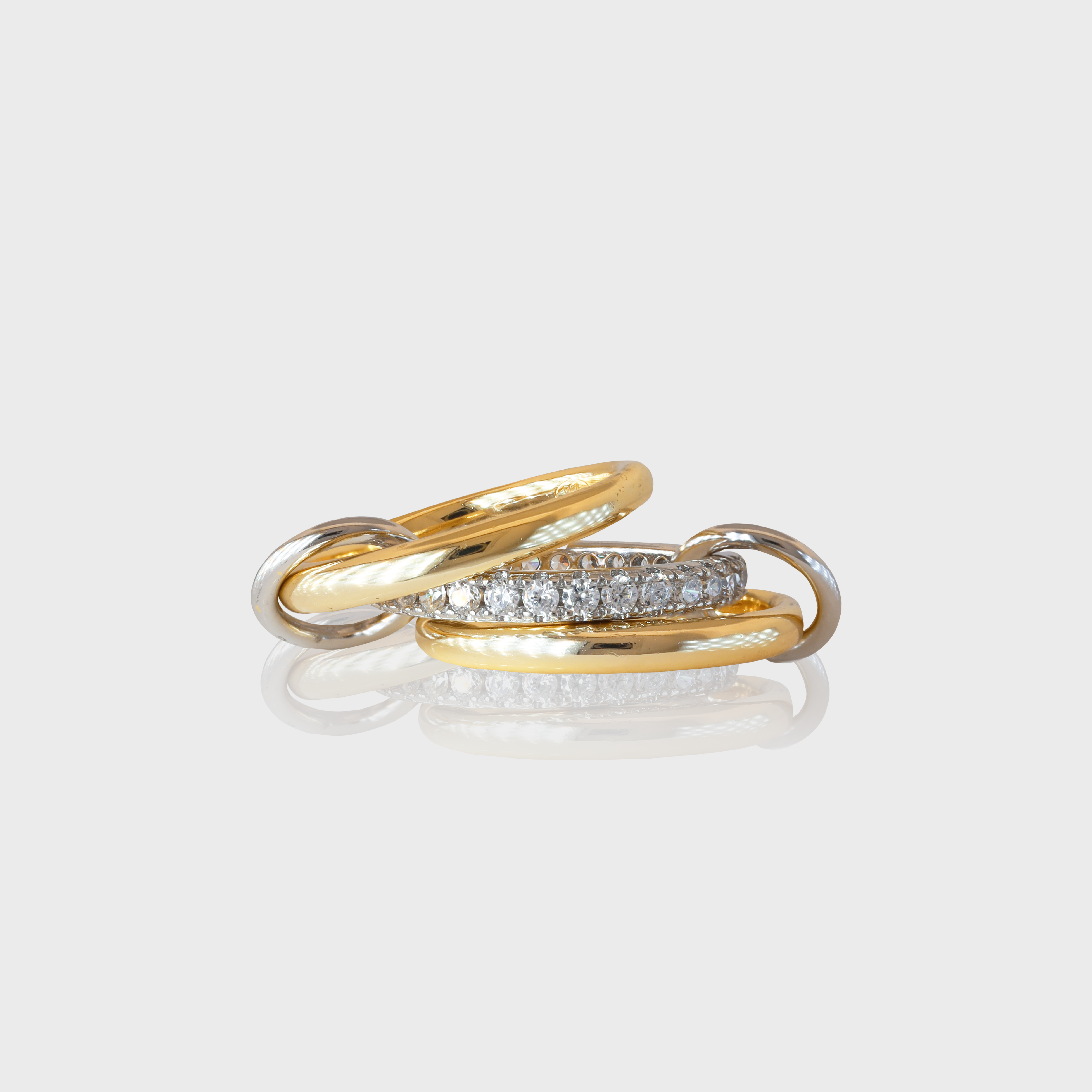 The Troy Ring offers the same luminous multi-tonal appeal with a touch of brilliance. This striking design features a trio of sterling silver bands, with the center band crafted from high-quality zirconia for a dazzling effect. The bands are connected by two elegant gold-plated connectors, creating a perfect balance of sparkle and sophistication. Ideal for both casual and formal occasions, the Troy Ring is sure to make a statement.