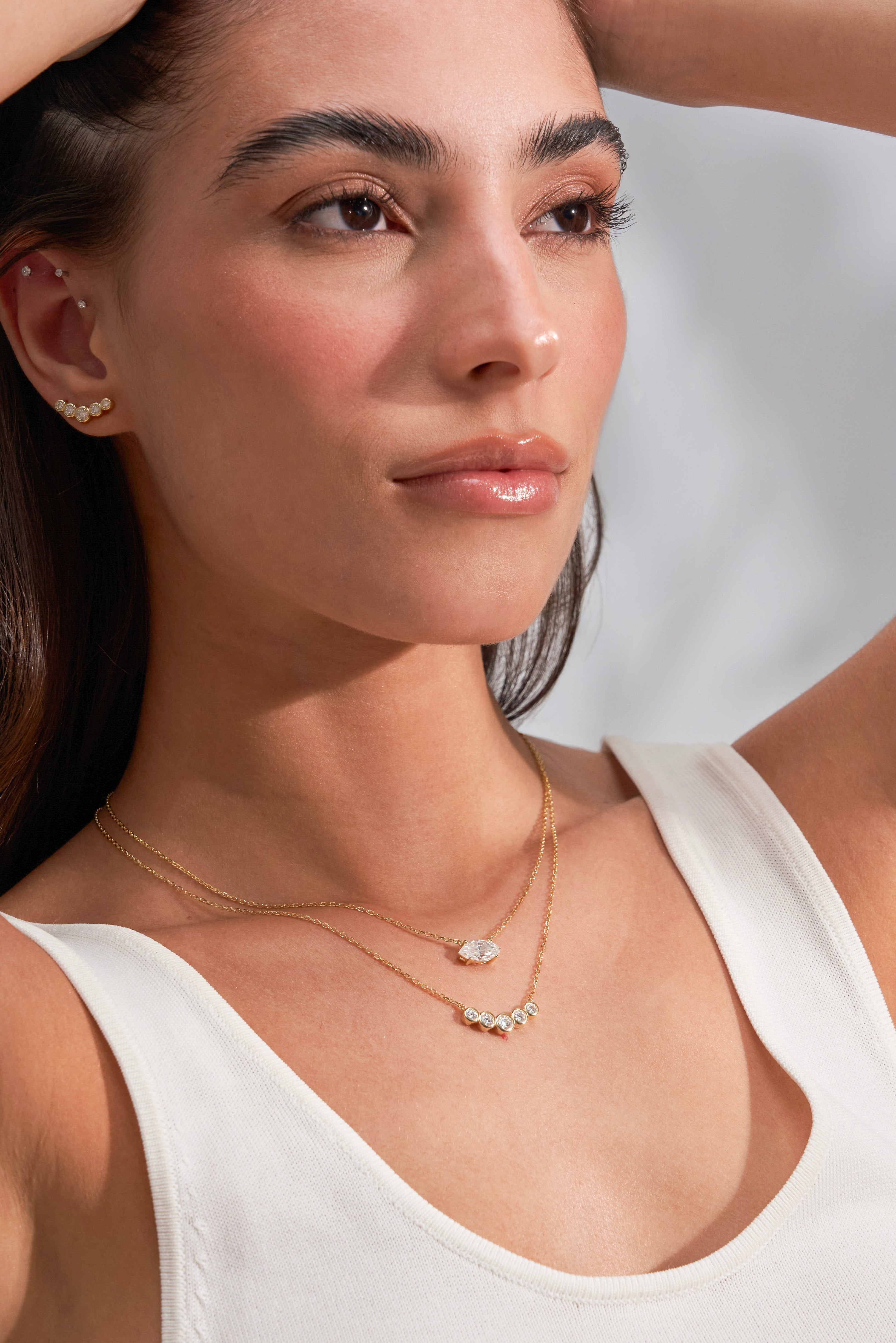 Design: A curved bezel-set centerpiece that hugs the neckline beautifully, offering a modern yet timeless look that layers effortlessly with other necklaces.