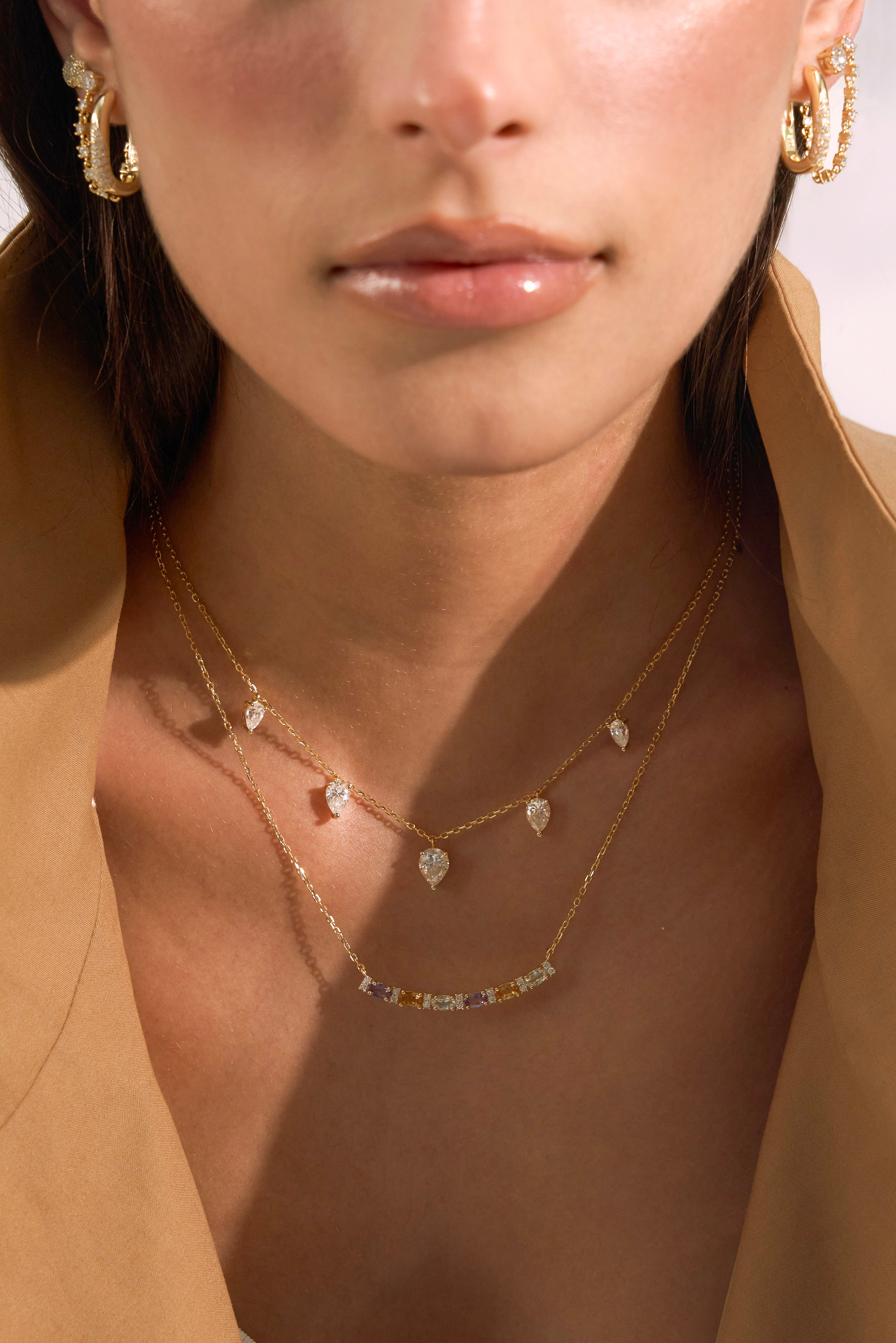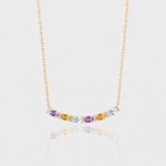 A luminous sweep of color, The Golden Hour Gemstones Necklace captures the sky at sunset—soft blues, glowing golds, and dreamy violets—framed with sparkling moissanite for extra radiance.
