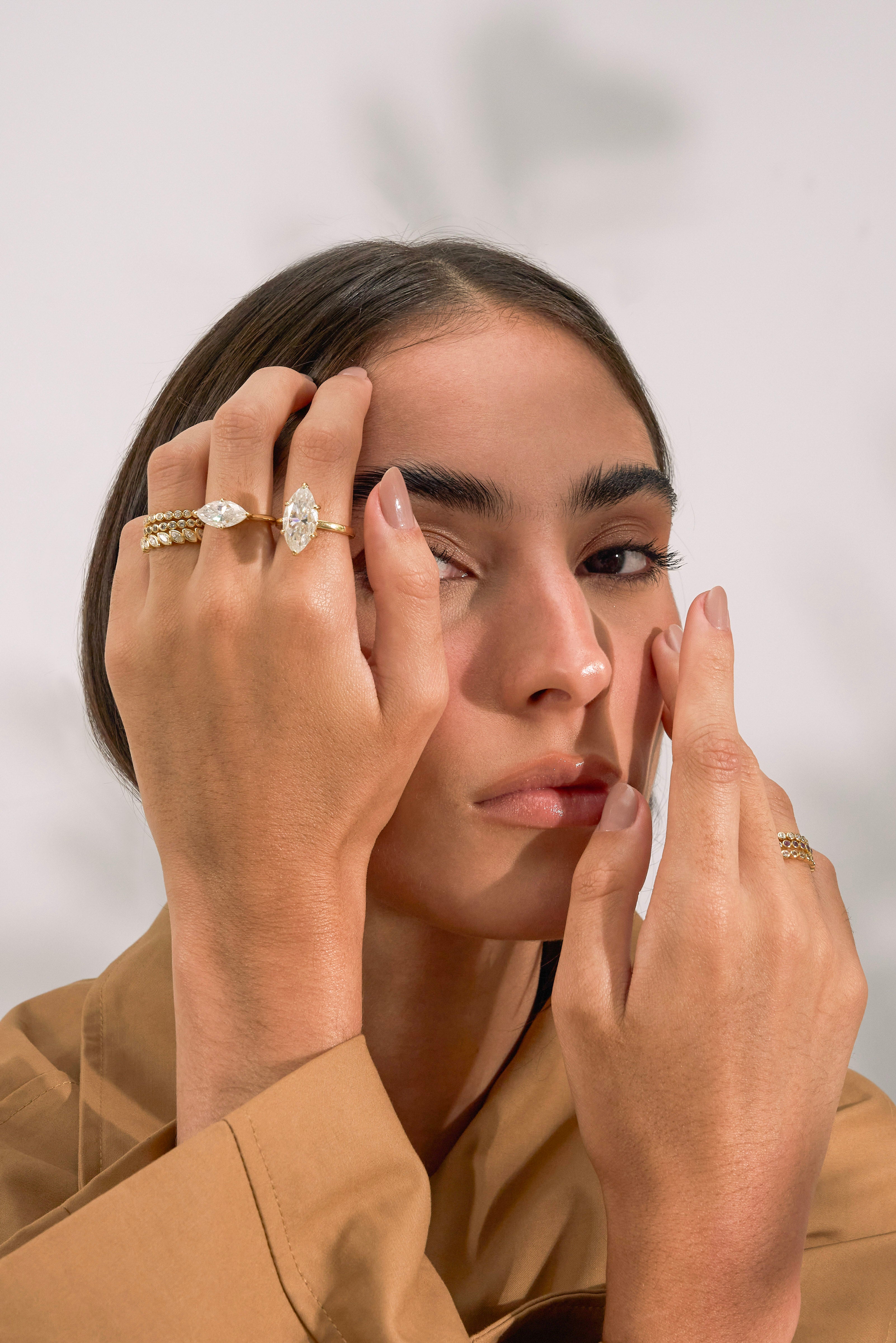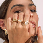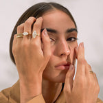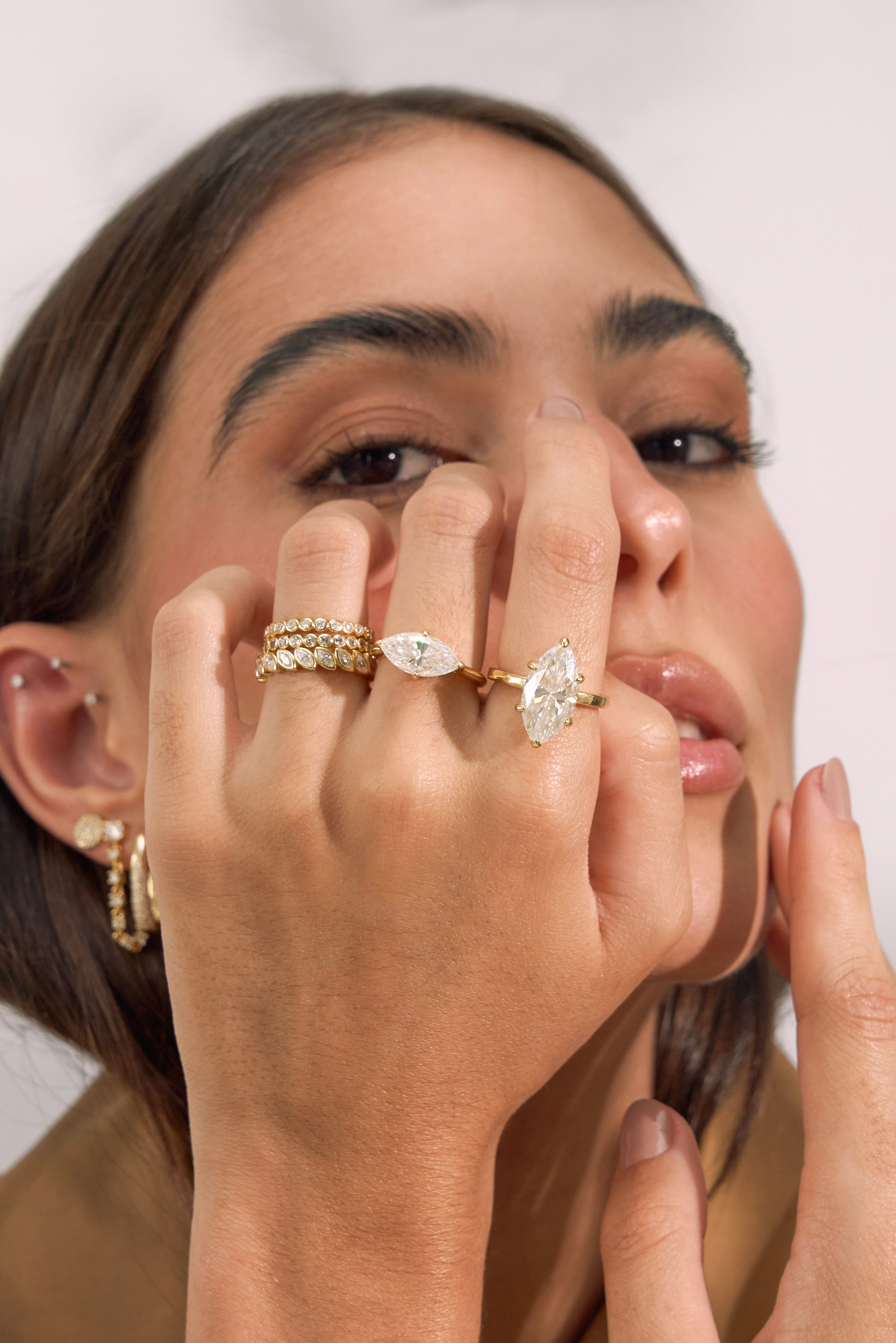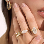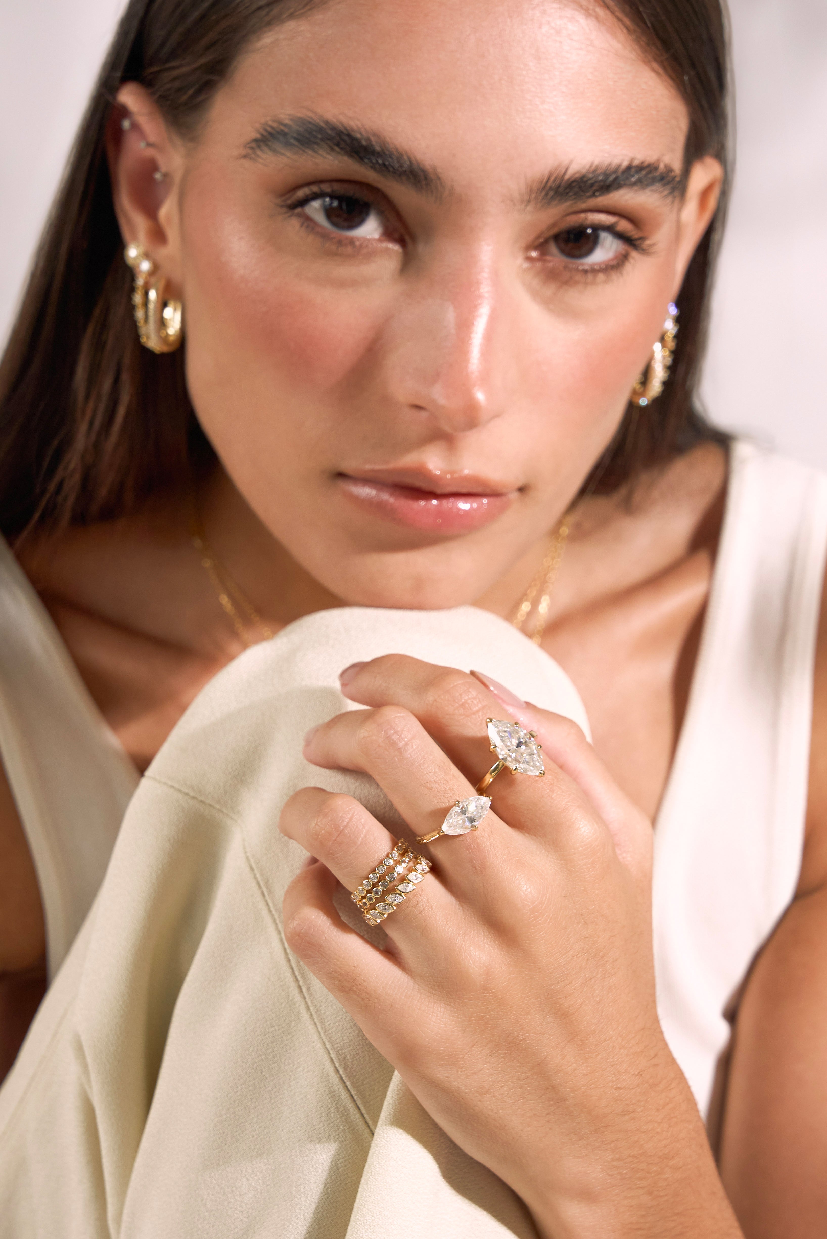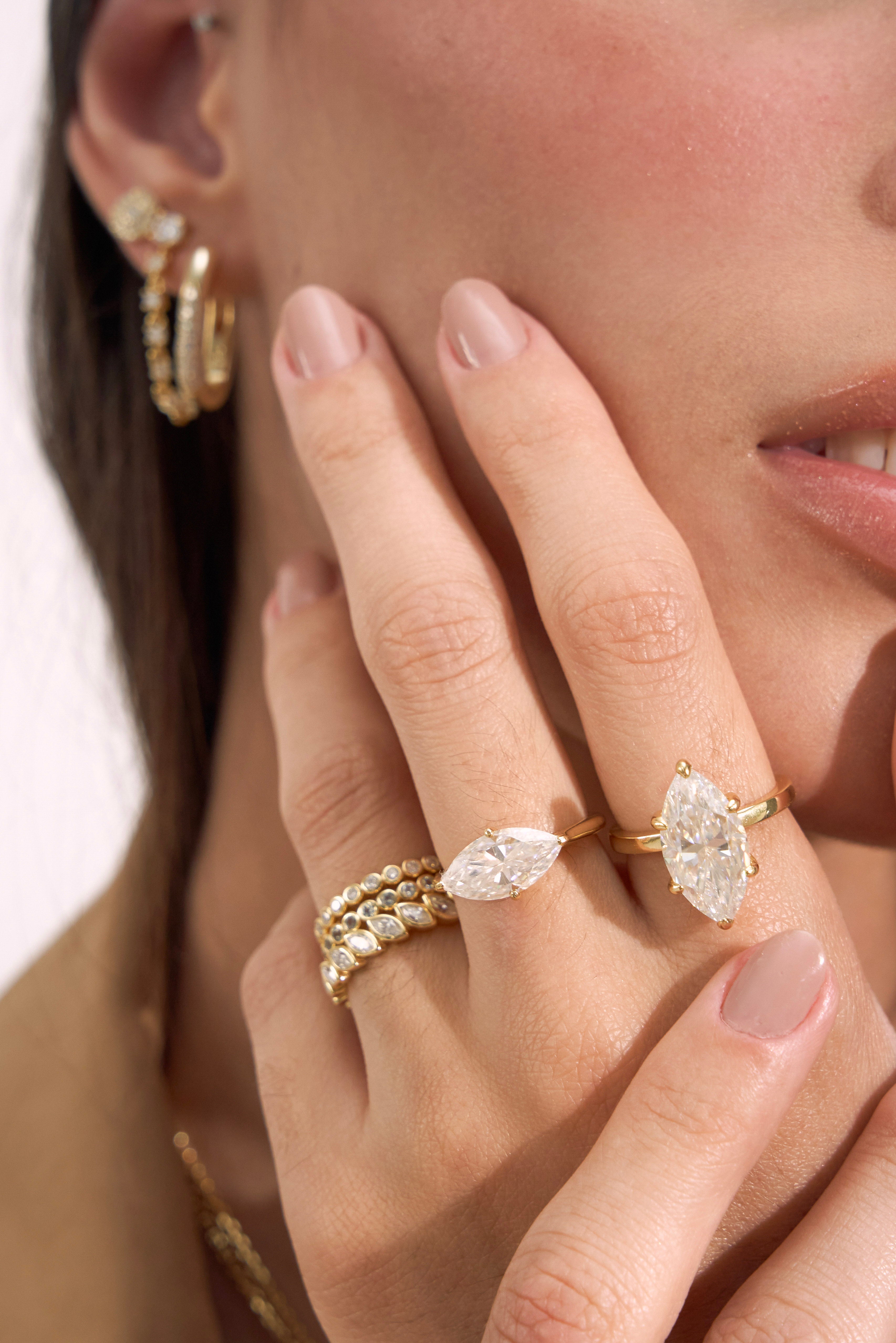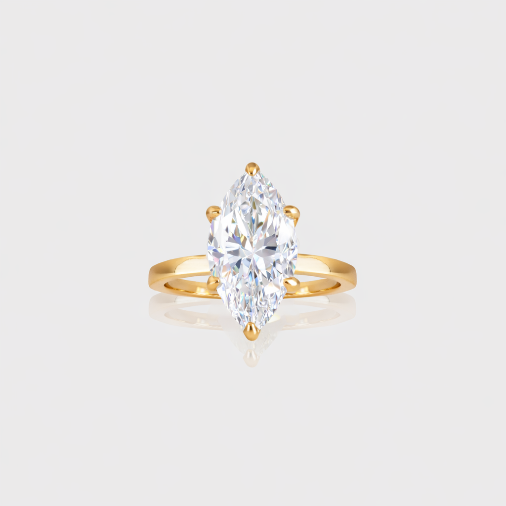 A bold, light-catching statement ring featuring an elongated marquise-cut moissanite that instantly elongates and refines the hand.