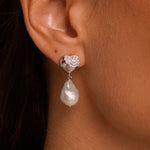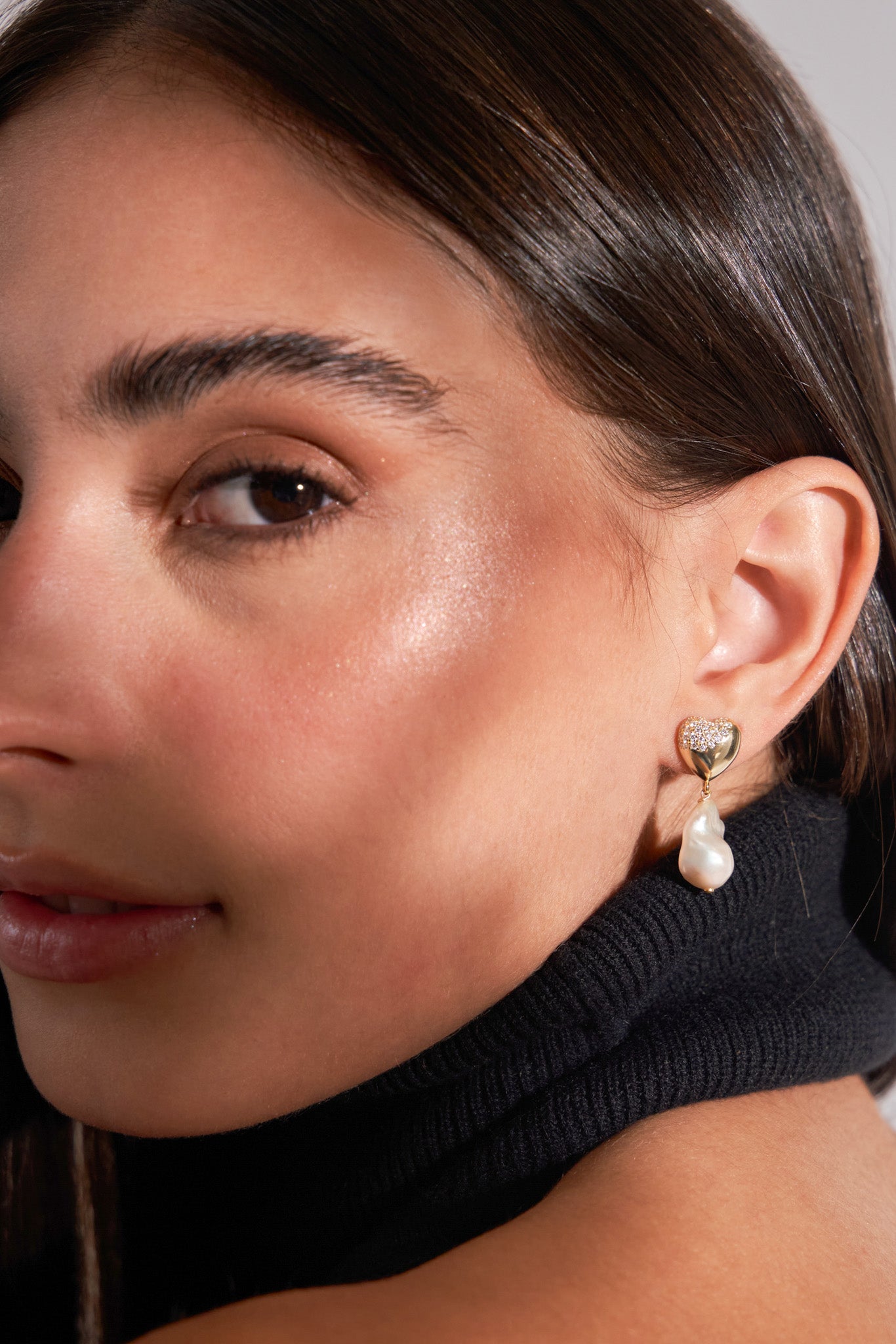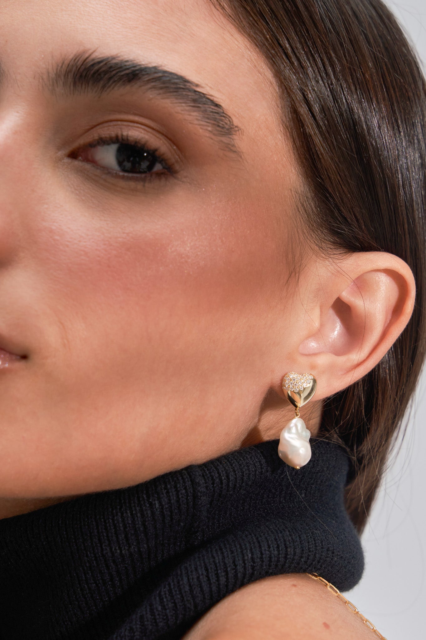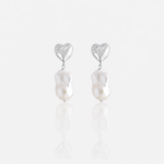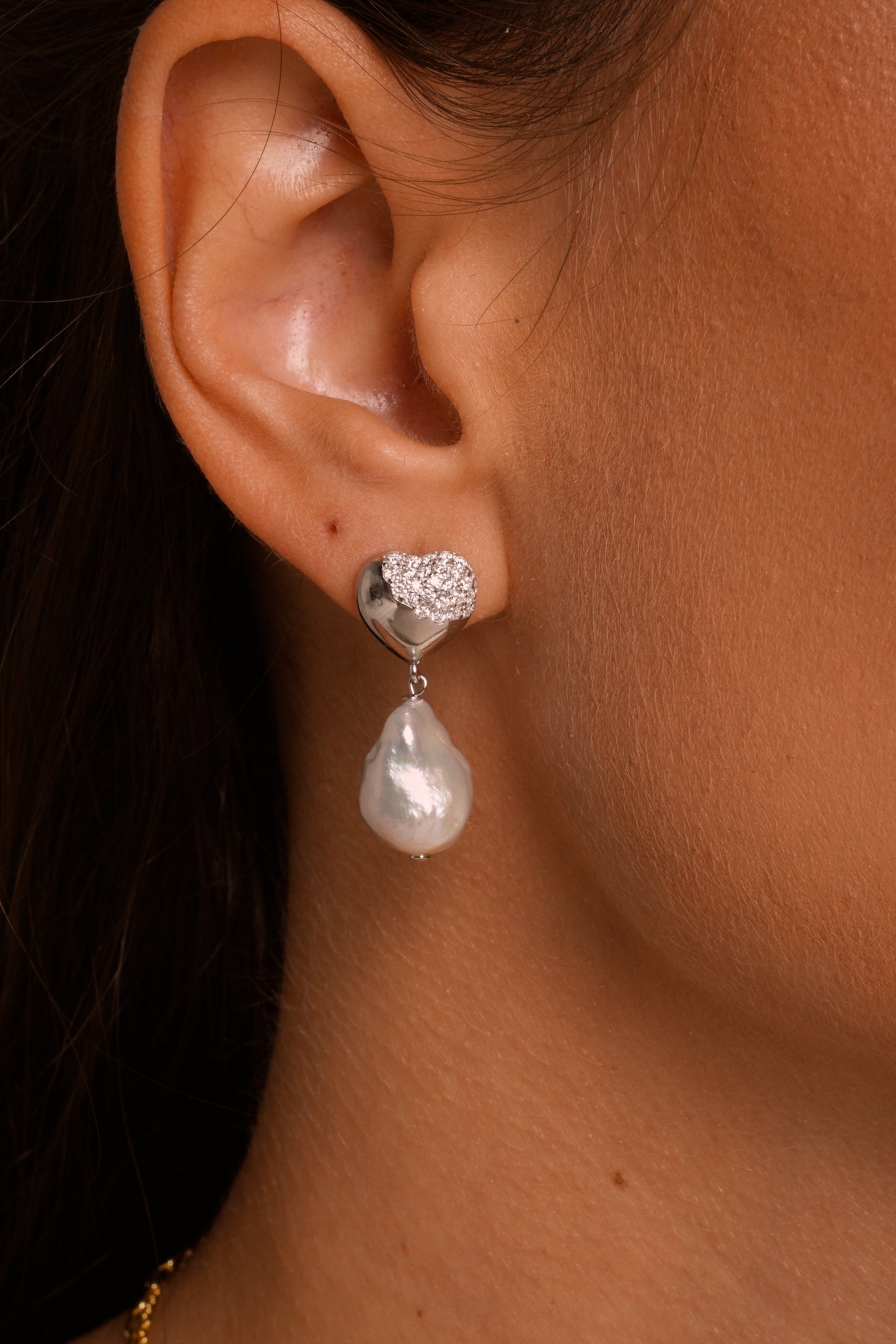 Design: Heart-shaped studs with pavé moissanite that gently transition into irregular baroque pearl drops, creating a romantic, sculptural silhouette.