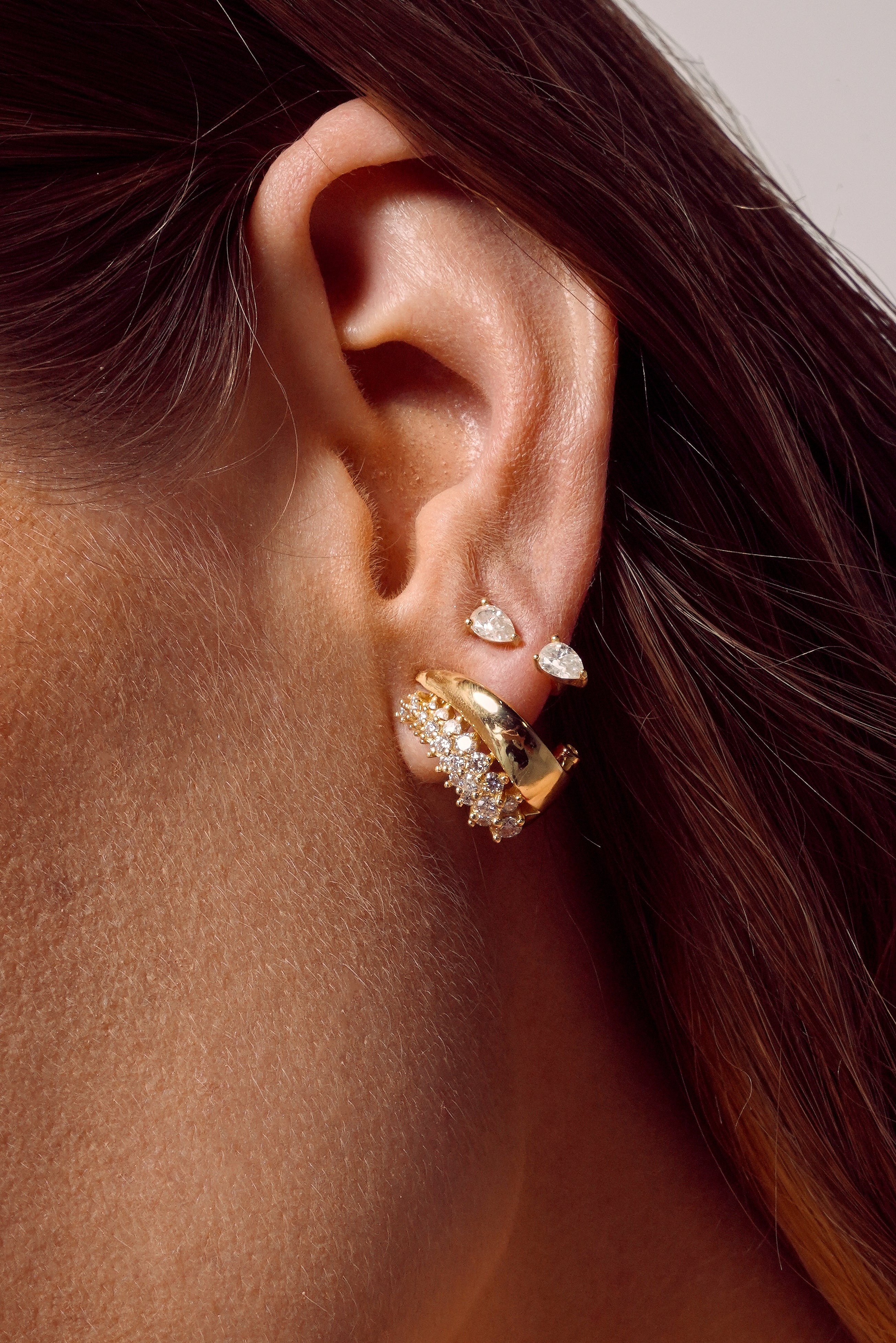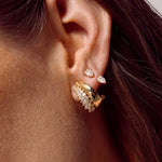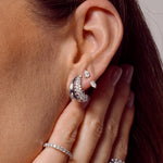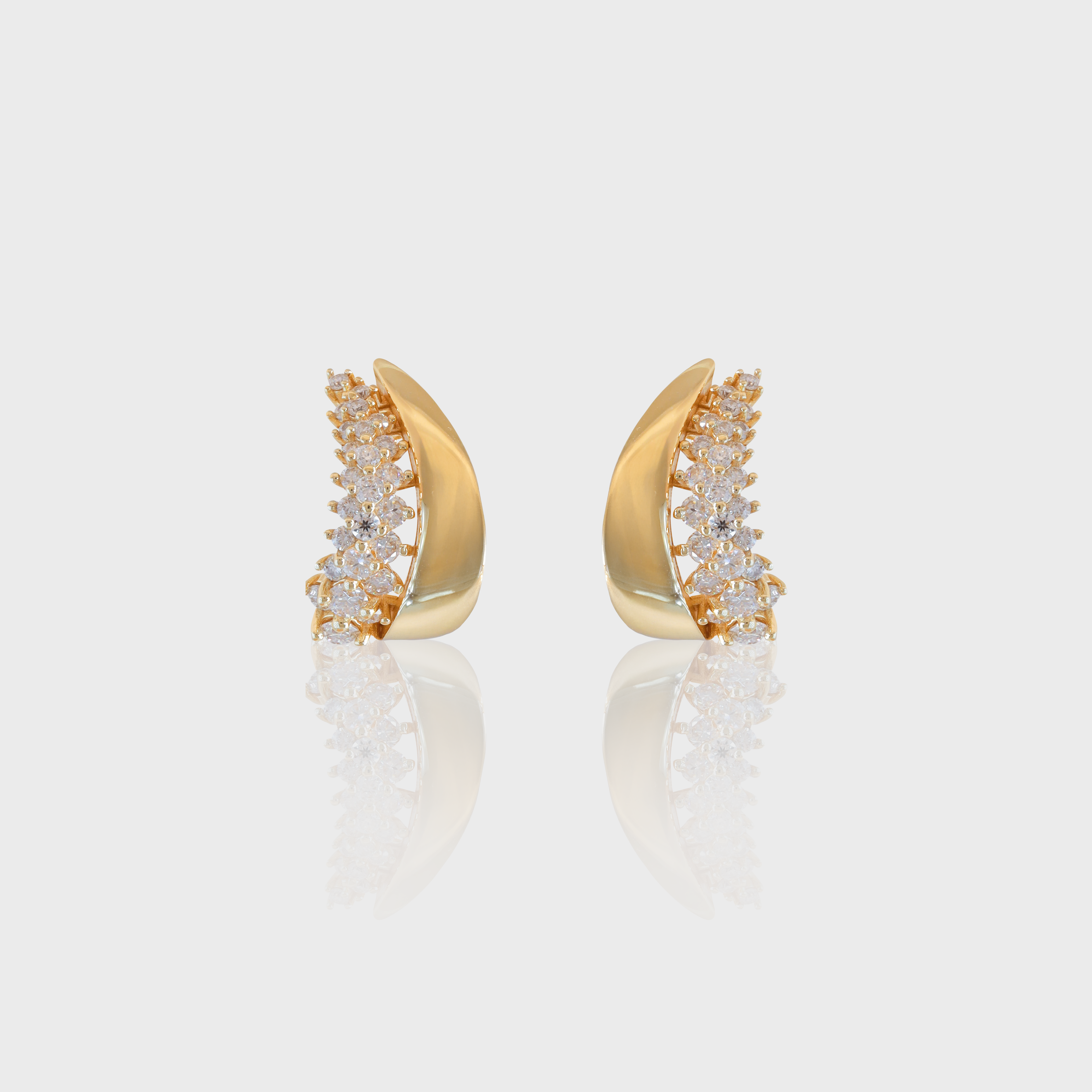 Elegant, sculptural, and brilliantly radiant — The Majestic Moissanite Earrings bring together bold curves and shimmering moissanite for a look that feels instantly elevated. Crafted from 925 sterling silver and finished in your choice of 14K gold or rhodium plating, this design features an 11×18mm silhouette that combines a smooth polished arc with a row of premium moissanite stones, creating a striking harmony of shine and dimension.
