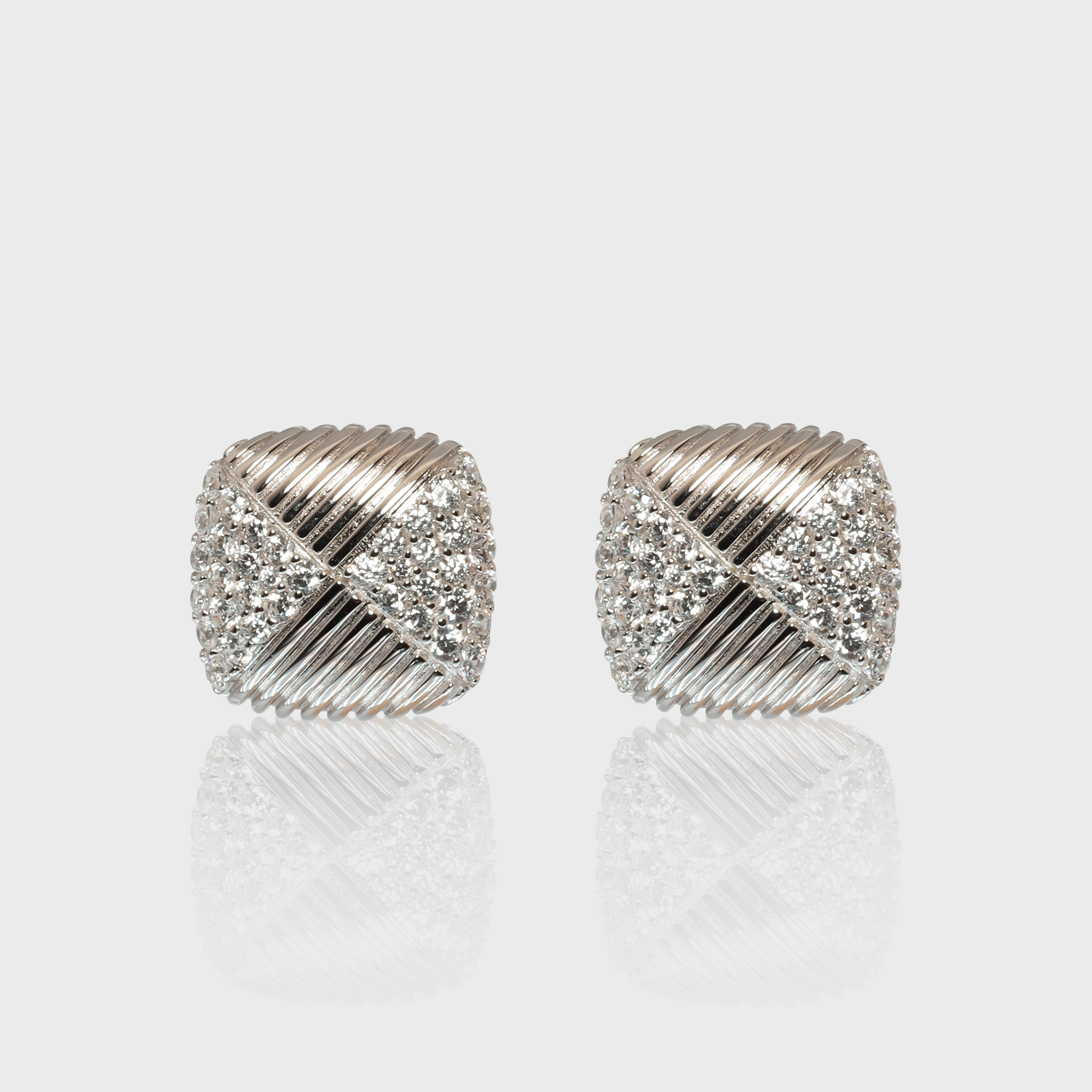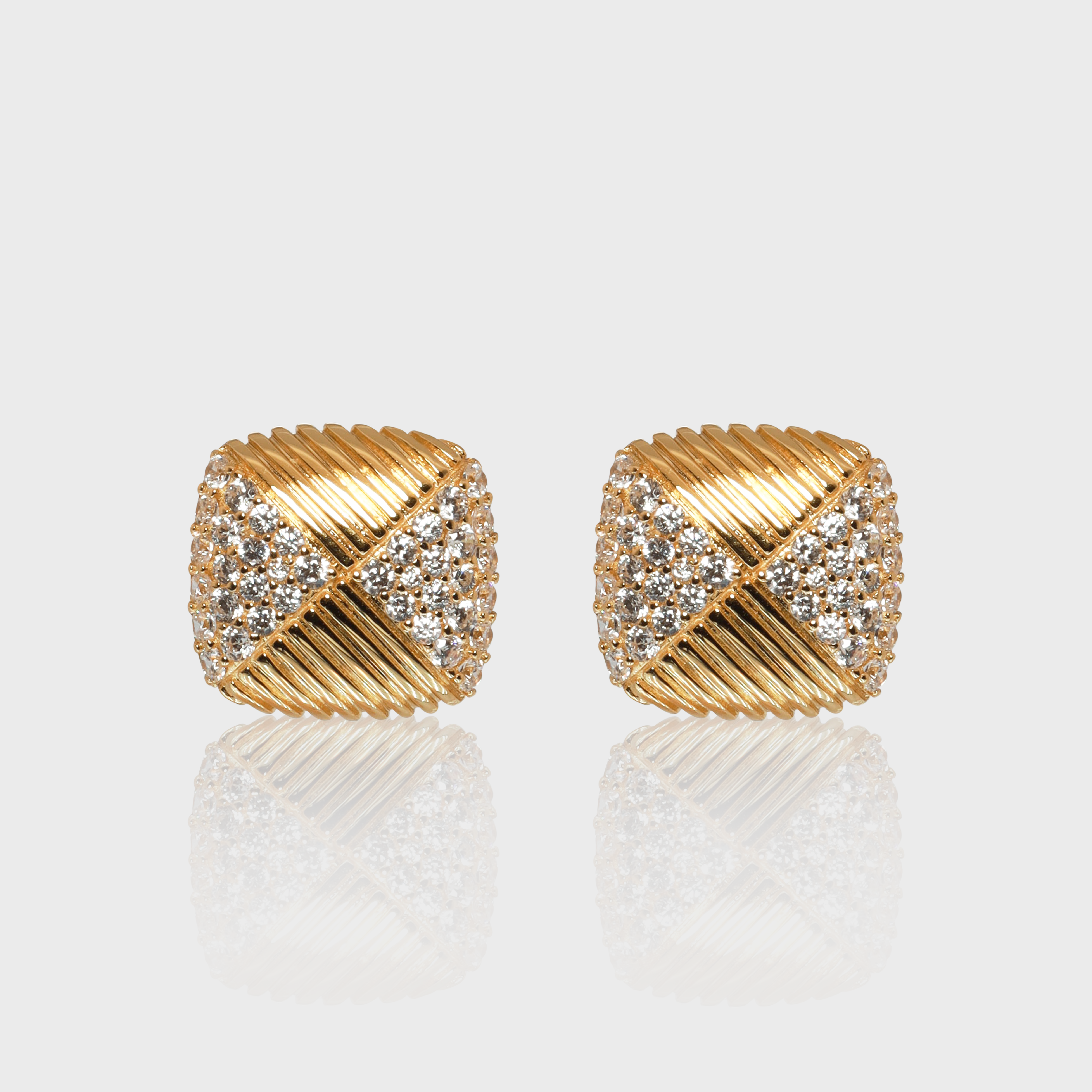 The Emanuela Earrings feature an elegant design with a crisscross pattern of sparkling stones set against a textured gold and rhodium-plated surface. These 15mm x 15mm earrings are lightweight and comfortable, making them the perfect statement piece for any occasion.