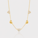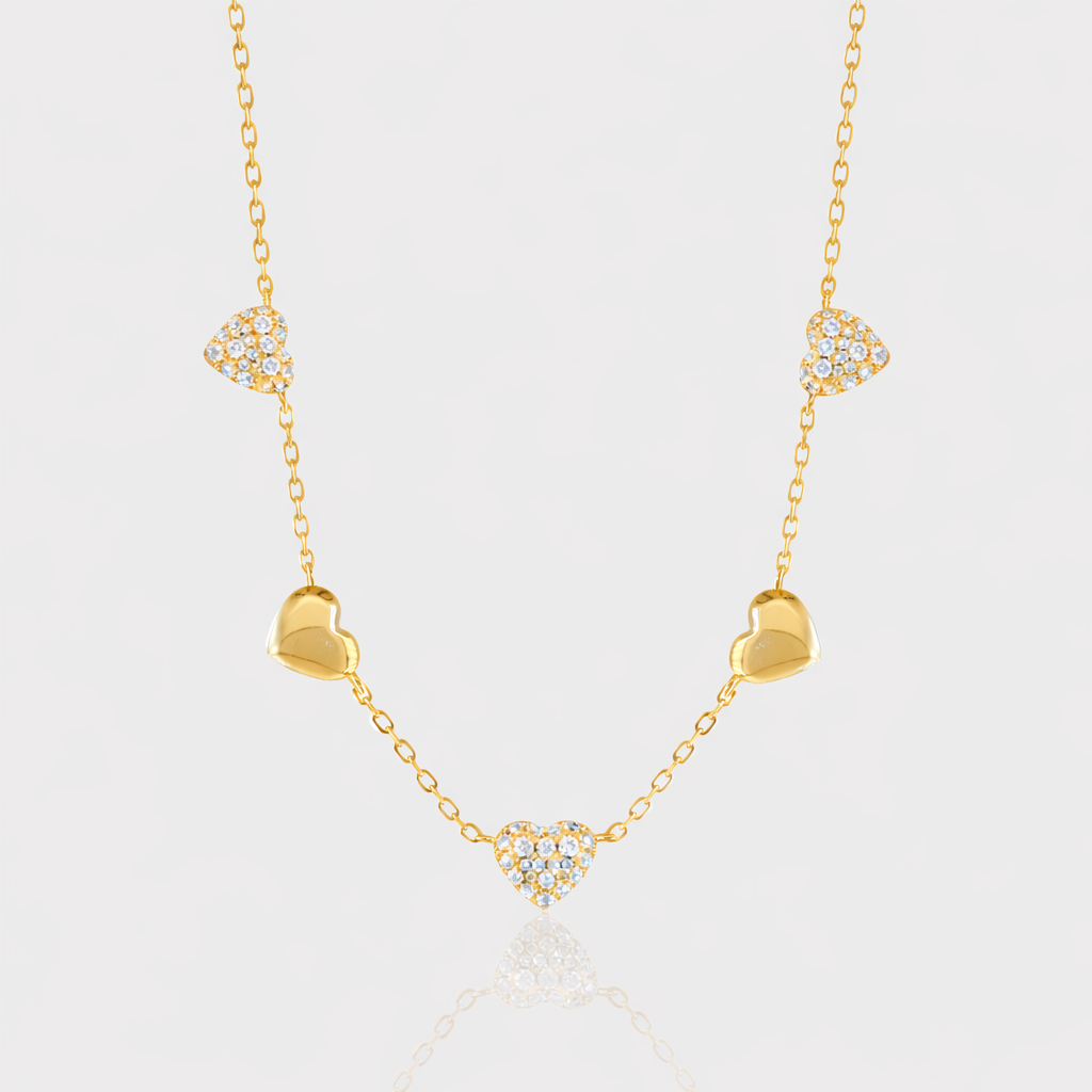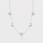 A romantic, playful, and versatile design — The Fantasy Moissanite Necklace brings modern charm to a timeless silhouette. Crafted with premium moissanite stones and finished in your choice of 14K gold or rhodium plating, this piece features five heart-shaped charms that can be worn two ways: with dazzling pavé moissanite facing forward or with a polished, minimalist heart for a softer look.