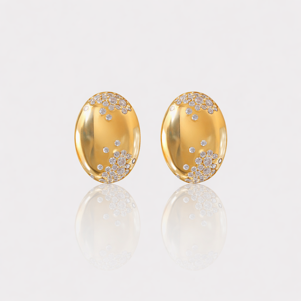 Soft curves, luminous shine — The Velvet Moissanite Earrings bring a sculptural elegance to your jewelry collection. Designed in 925 sterling silver and plated in your choice of 14K gold or rhodium, each earring features a smooth, domed silhouette accented with scattered premium moissanite stones for a refined, modern sparkle. Their 12×17mm shape offers a statement presence while remaining effortlessly wearable for any occasion.