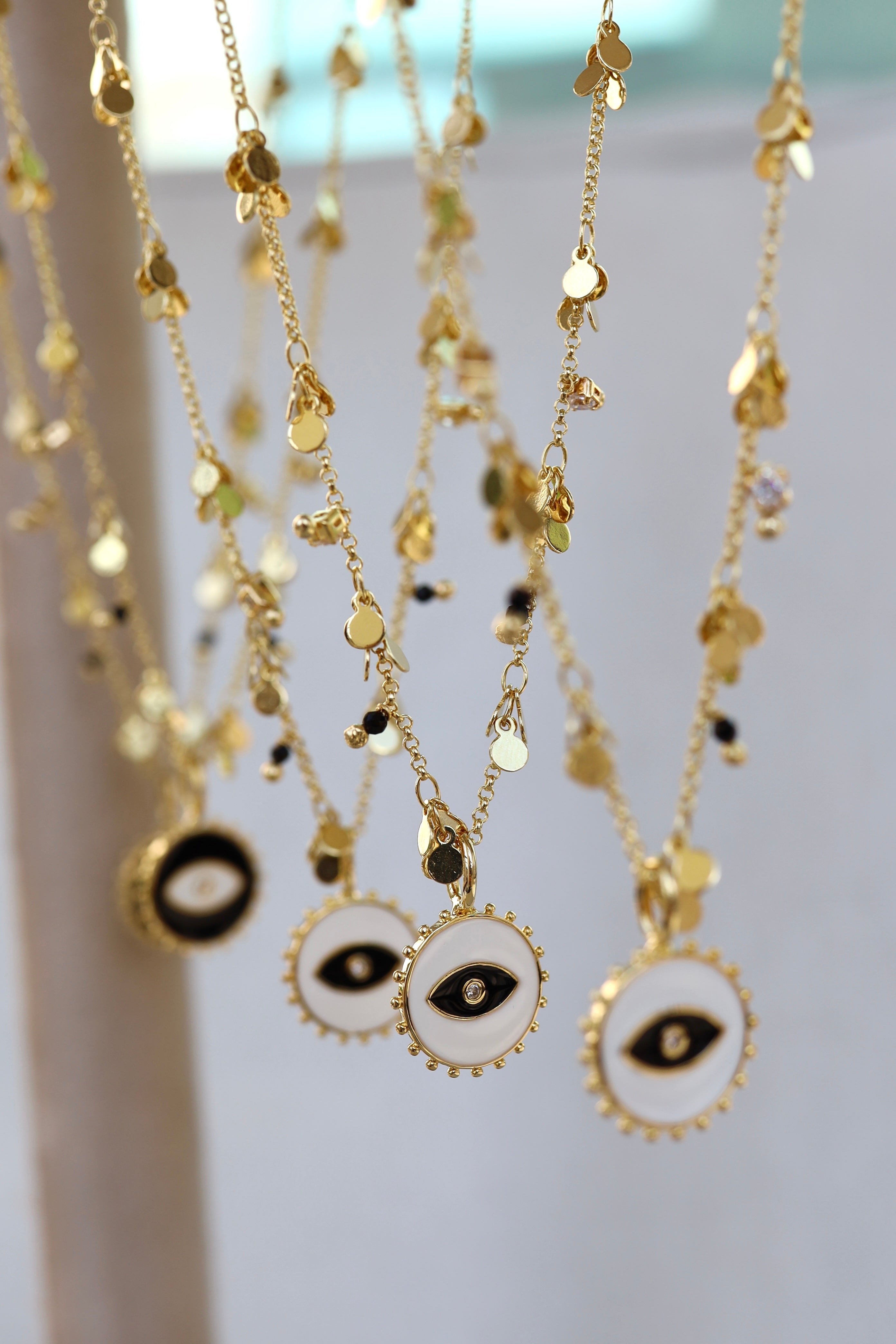 Description: Add an original piece to your collection. The evil eye pendant in Gold is an eclectic style featuring that iconic amulet representing protection, wisdom and possibility.