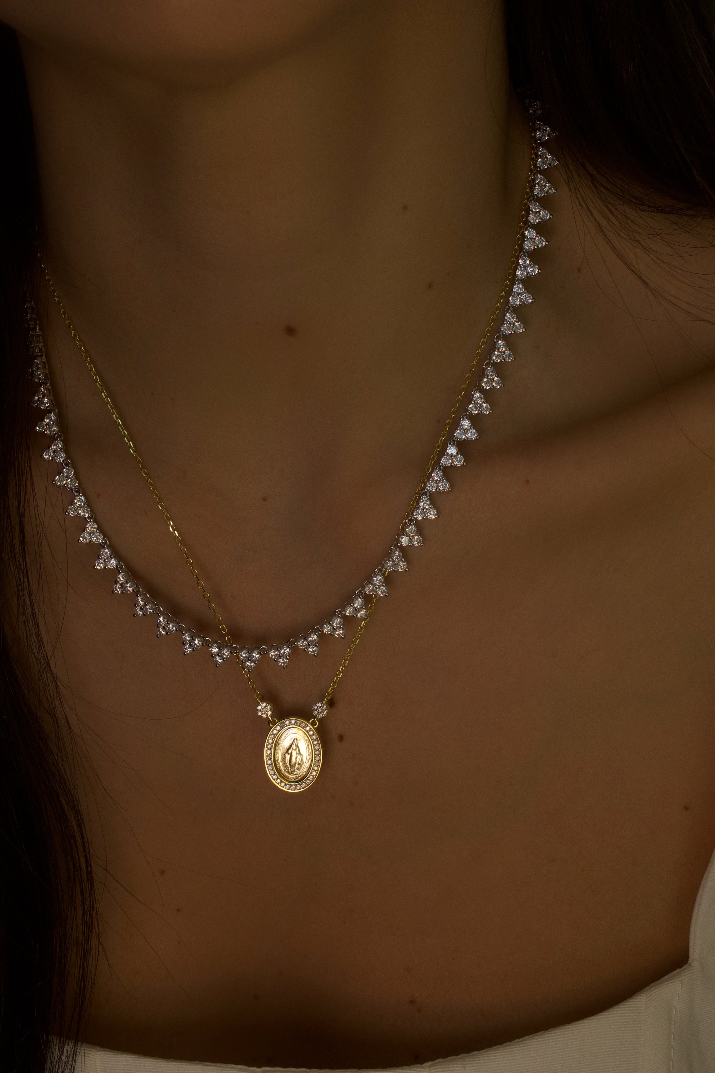 Elevate your style with the divine beauty of the Cheverny Necklace. Crafted with 925 sterling silver and plated in 14K gold or rhodium, this necklace features high quality crystal zircons for a touch of shimmer. Hypoallergenic and nickel-free, it comes in a delicate 16" (40cm) length with a 2" (5cm) extender for a comfortable fit.