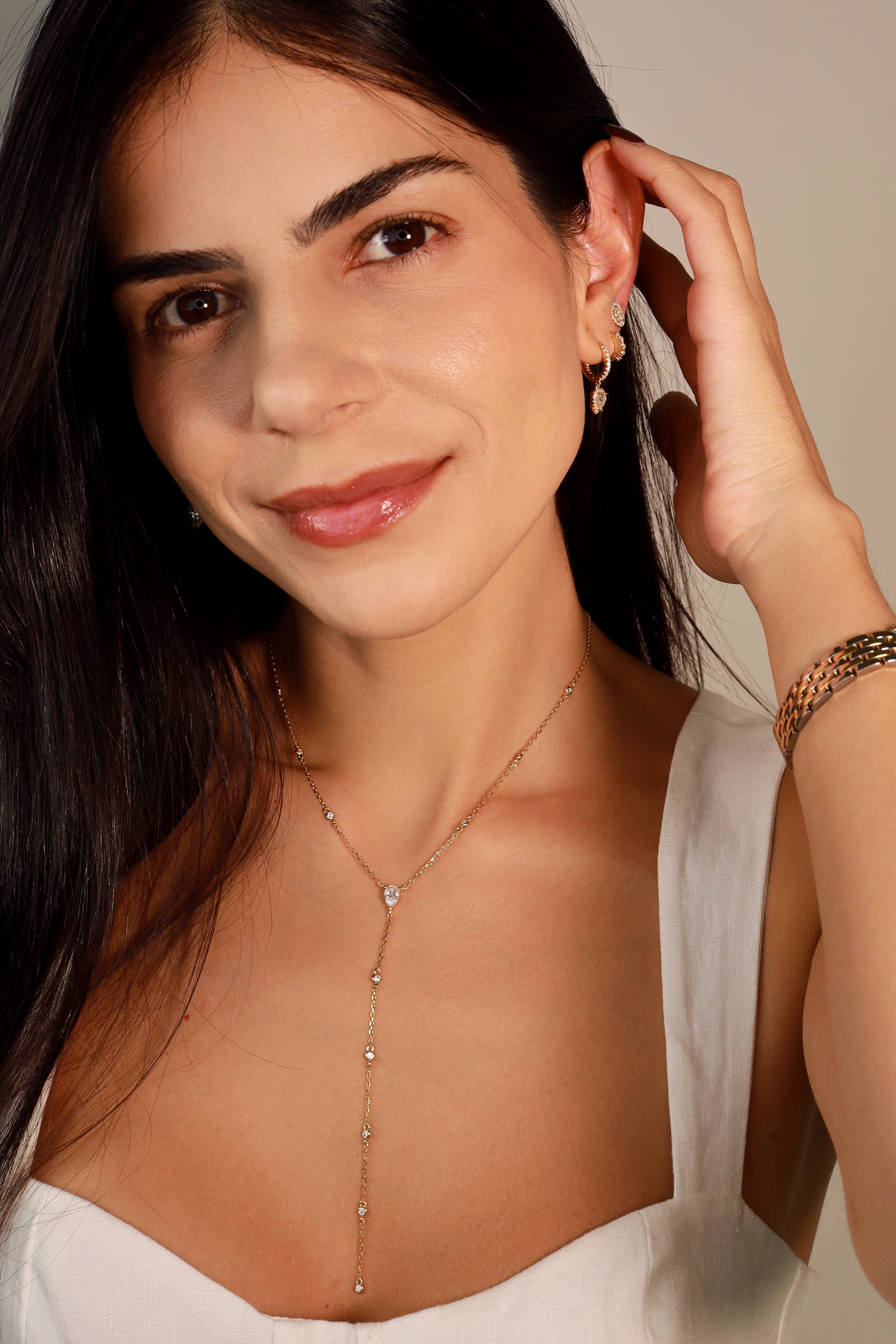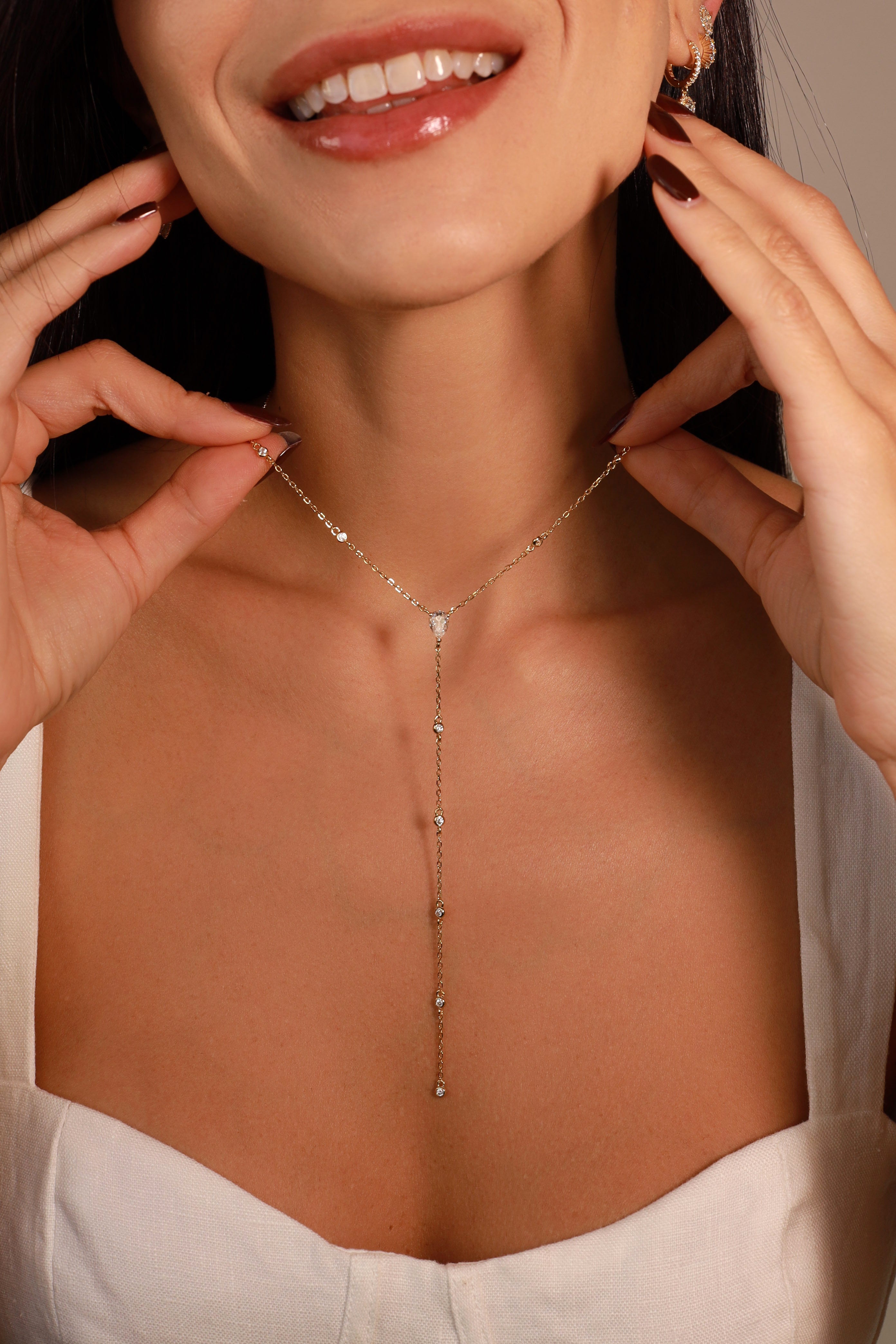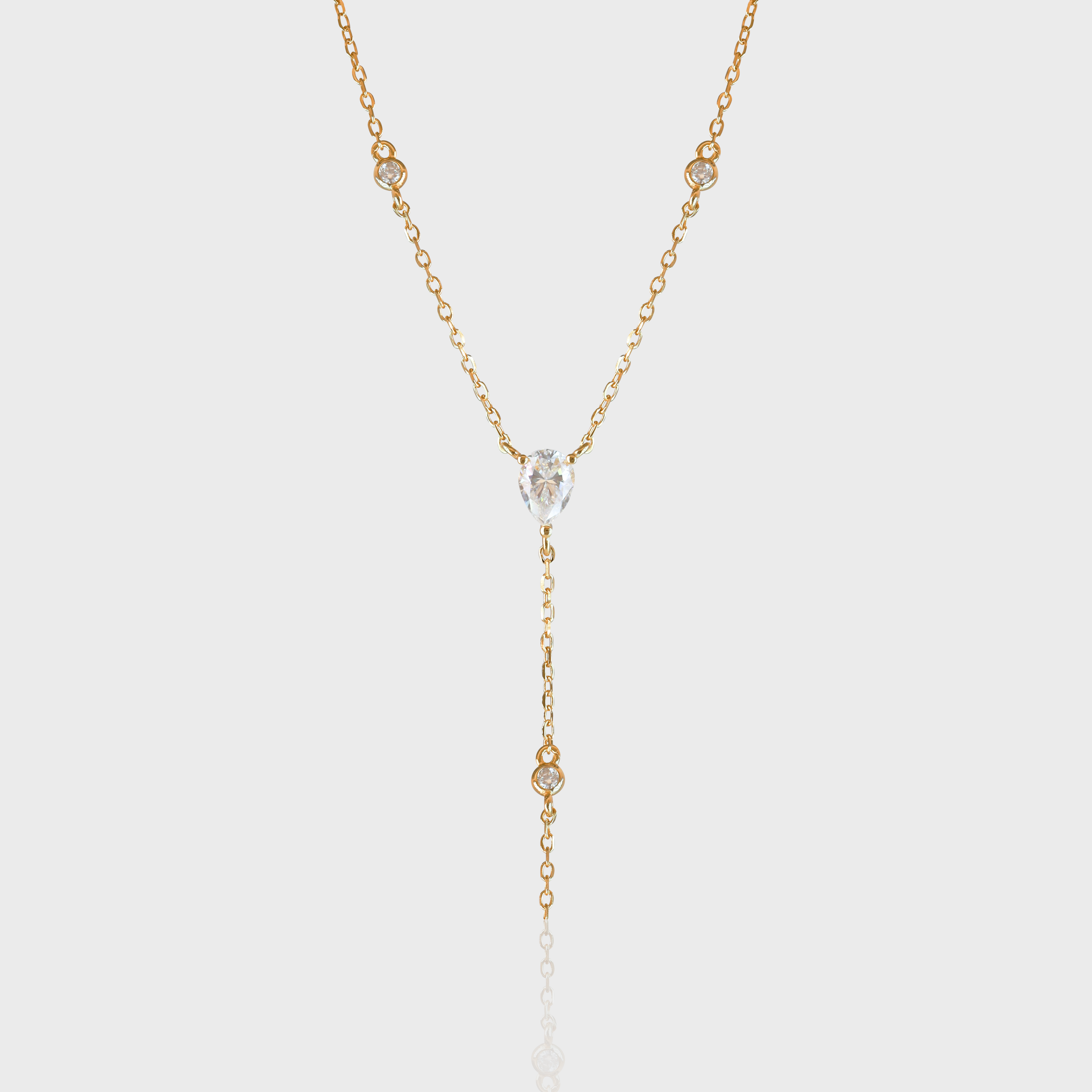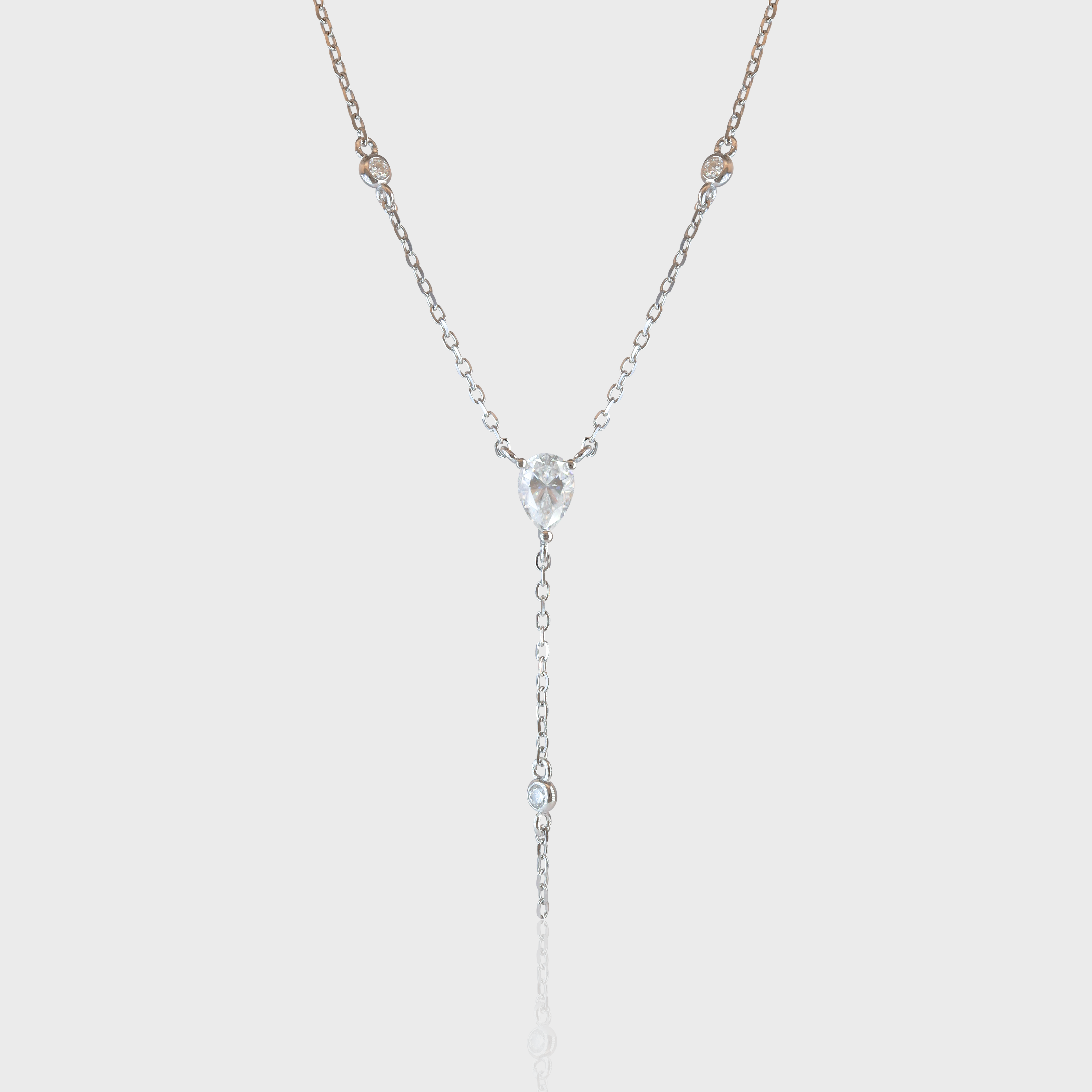Discover the allure of The Charm Tie Necklace, a refined piece that adds elegance to any outfit. Featuring a pear-shaped centerpiece and delicate accents along the chain, this 37cm necklace, with an additional 5cm extender (14.5 inches + 2 inches), allows for versatile wear and styling. Available in both gold and rhodium plating.