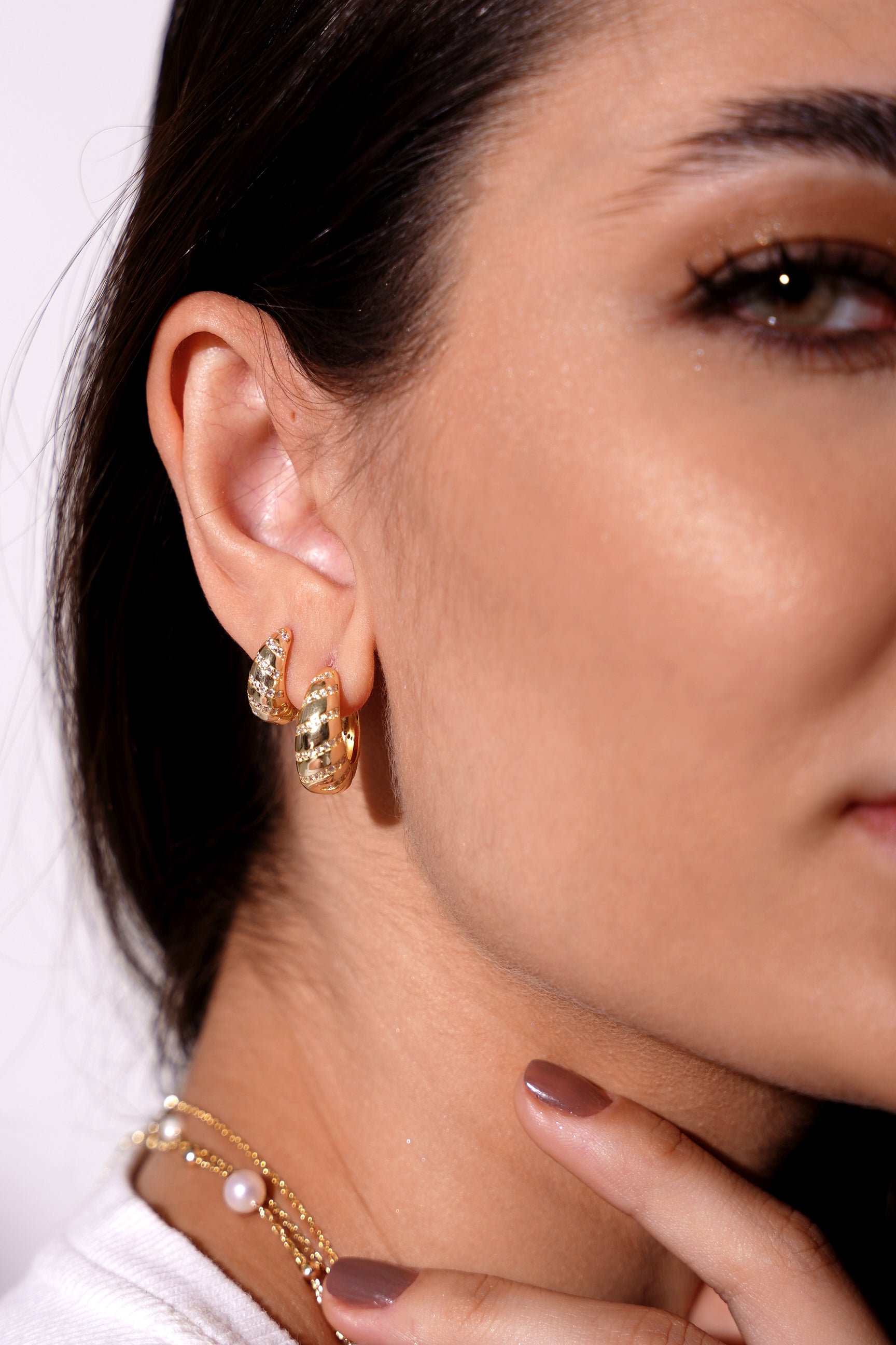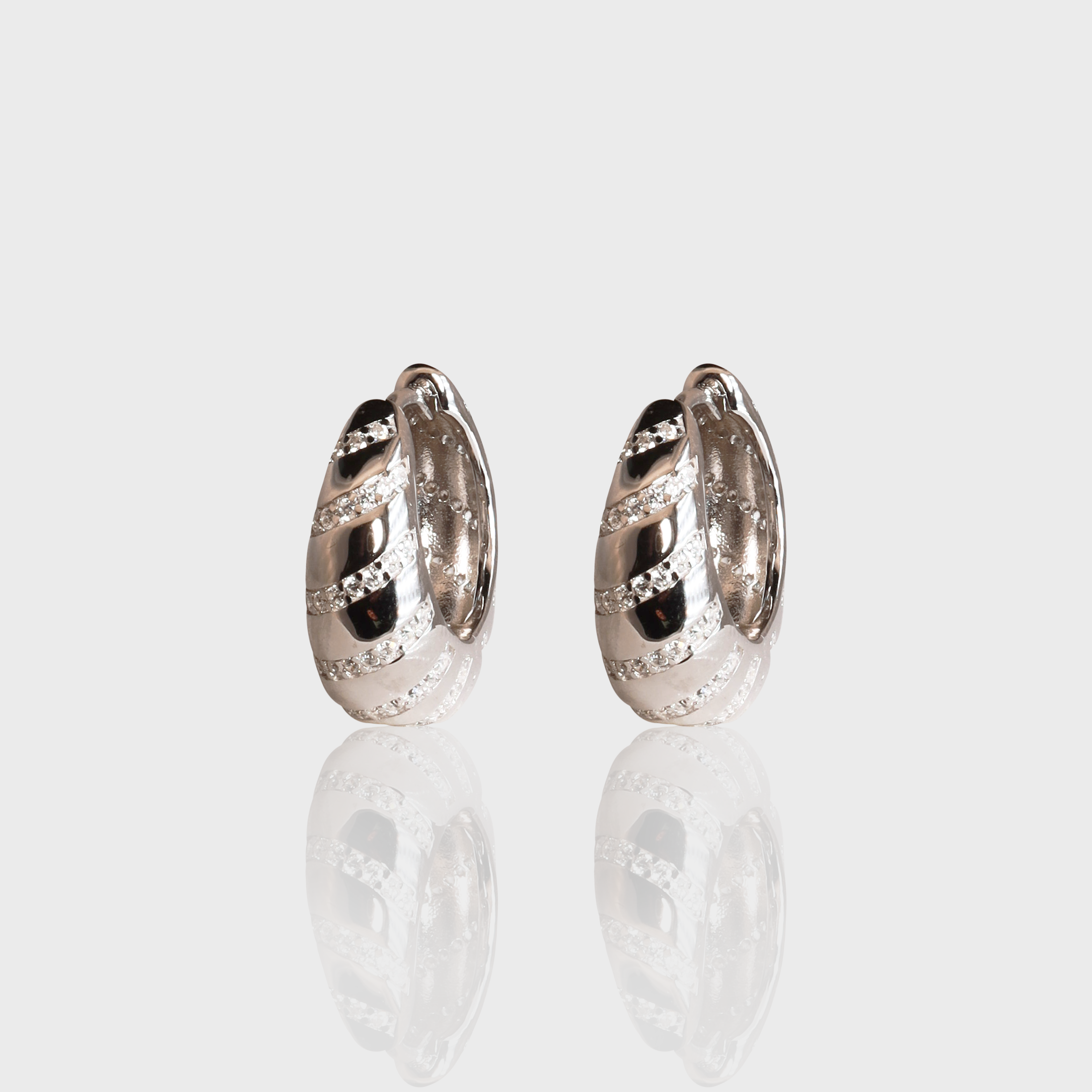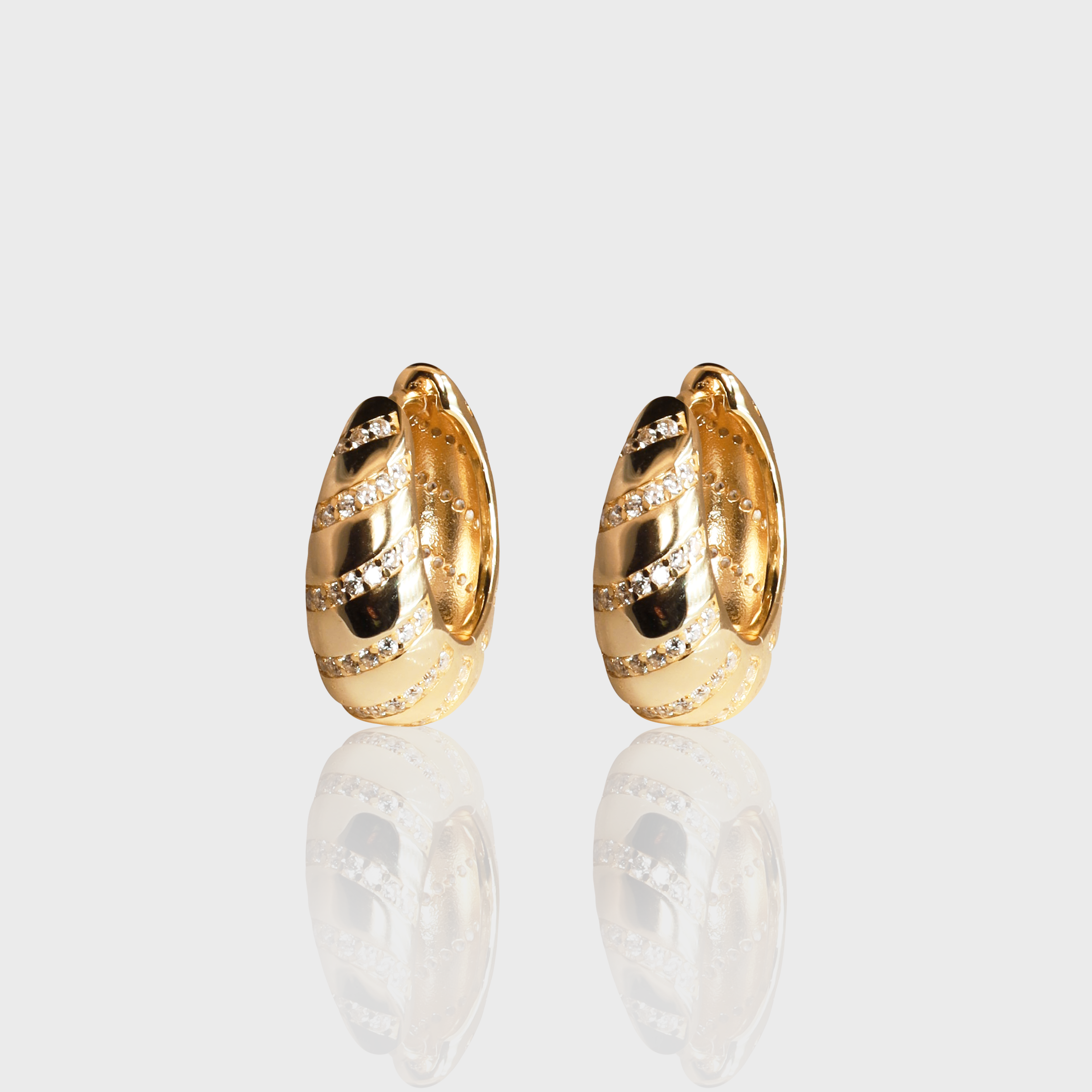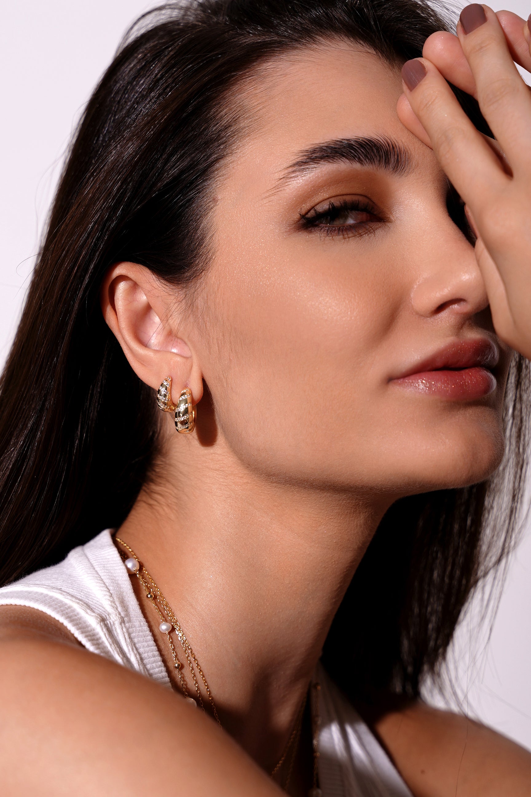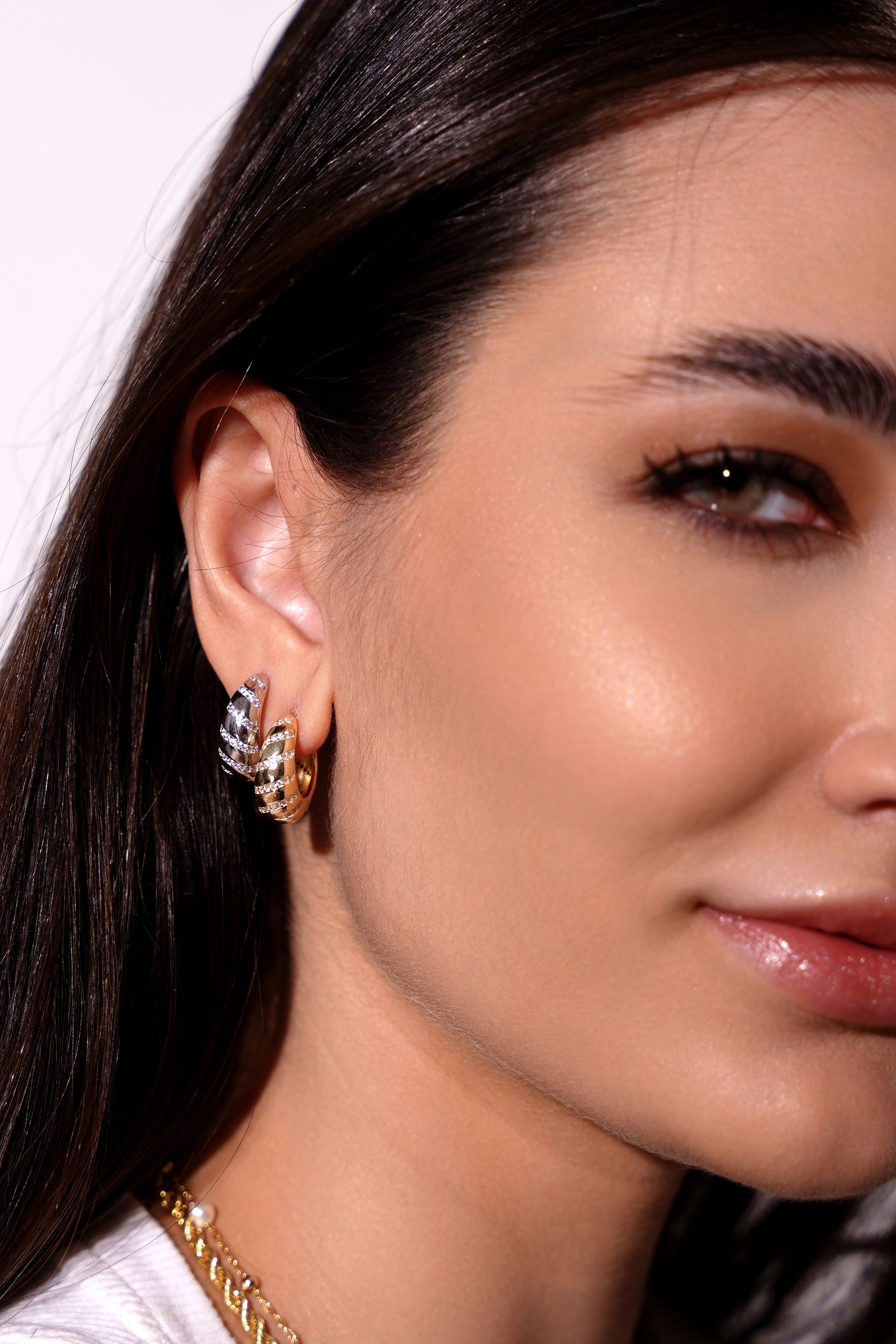 The Alix Hoops feature a bold and elegant design with alternating gold and rhodium-plated bands, accented with sparkling stones. Available in two sizes (14mm and 18mm), they can be worn together for a layered look or separately for a more subtle statement. Crafted from 925 sterling silver, these hoops are the perfect blend of sophistication and modern style.