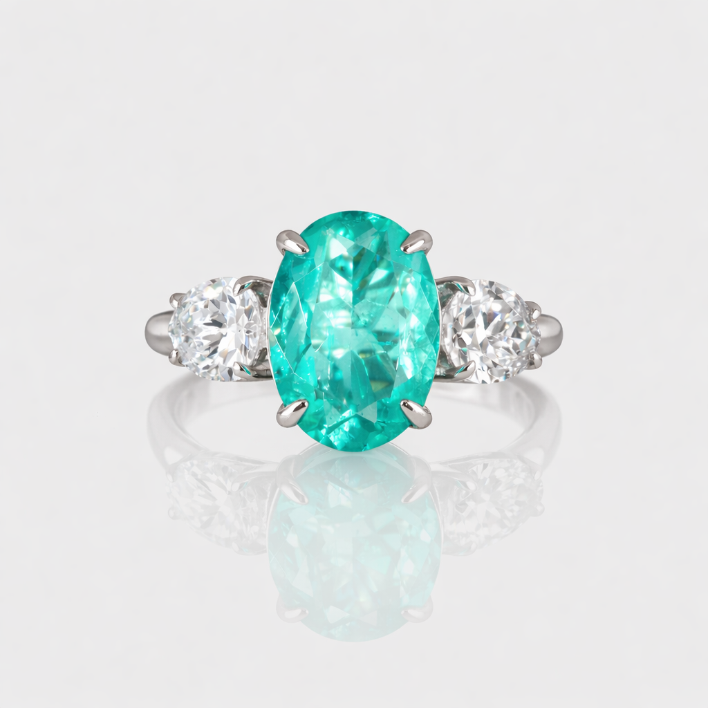 - Design: Centered with a striking Paraiba fusion stone, complemented by white zirconia stones on the sides for extra brilliance