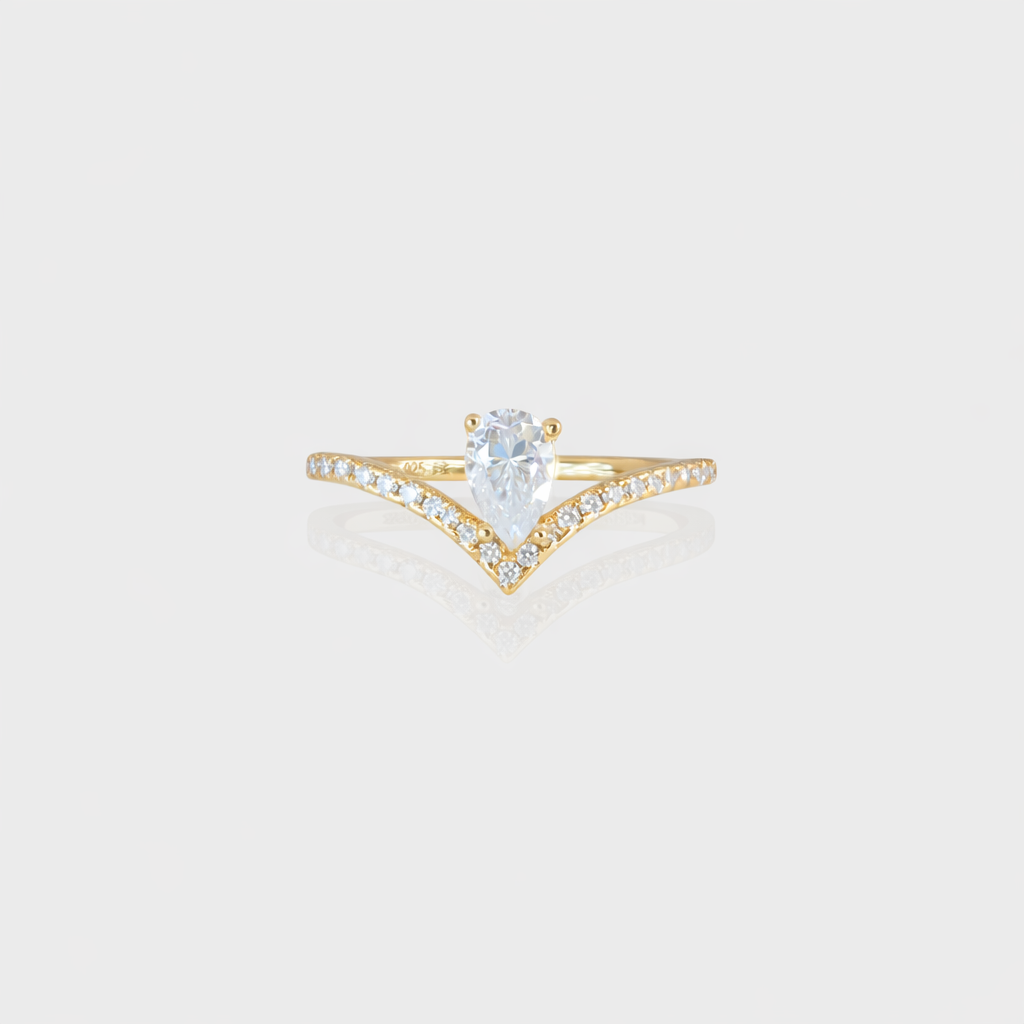 Graceful and striking, The Crown Moissanite Ring embodies refined brilliance and timeless sophistication. Designed with a delicate pear-cut moissanite as the centerpiece, it is complemented by a V-shaped band adorned with a row of dazzling round-cut stones — a perfect balance between modern minimalism and regal charm.