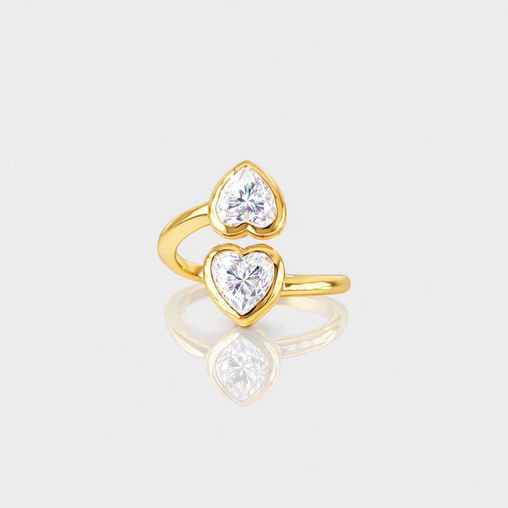 Delicate, luminous, and endlessly romantic, The Ethereal Moissanite Ring features two brilliant heart-cut stones that wrap gracefully around the finger. Its open silhouette and polished finish make it a standout piece designed to elevate any look—and its slightly adjustable fit ensures effortless comfort.