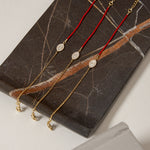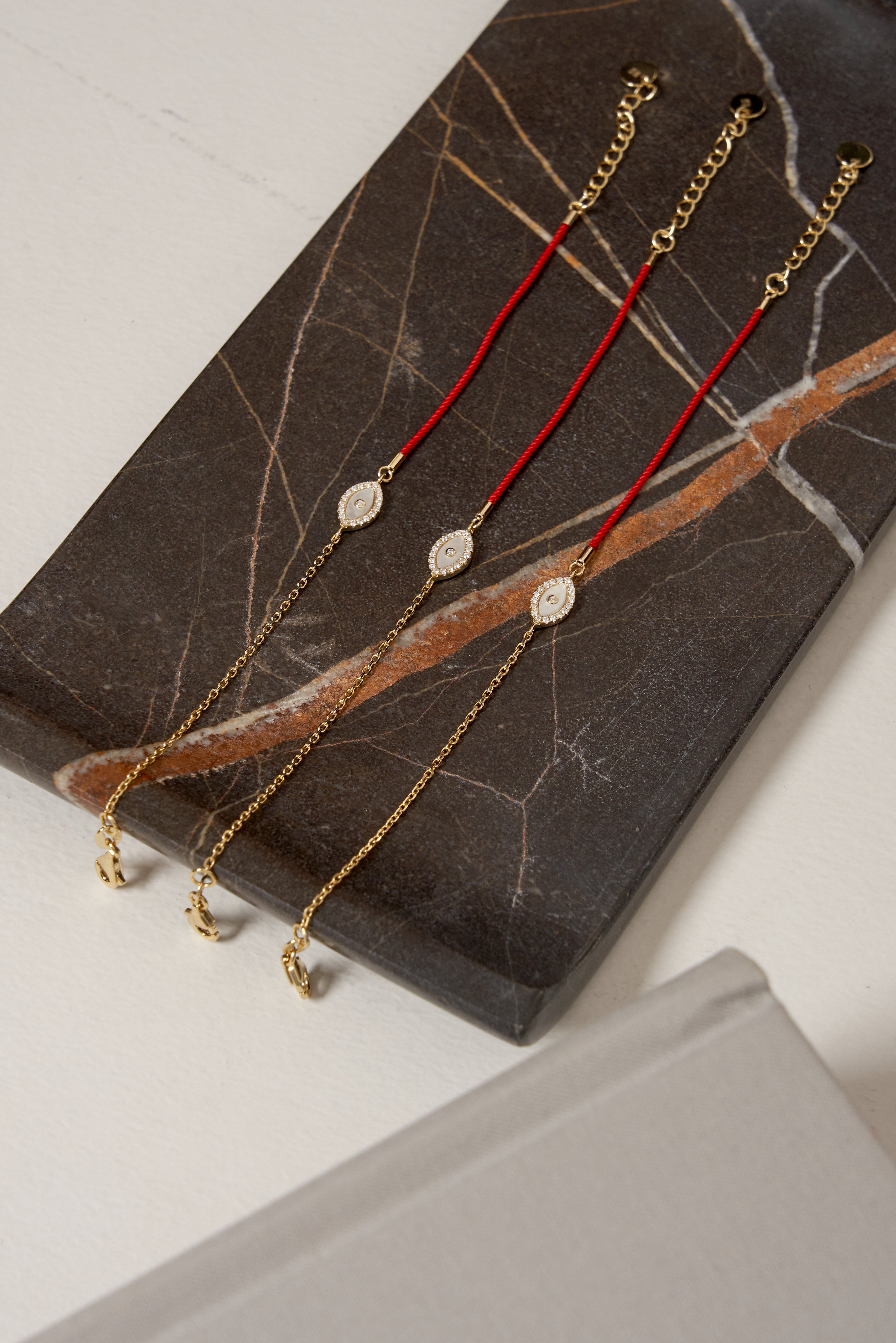 A modern talisman of luck and light, The Fortune Moissanite Bracelet is designed to bring positivity and timeless style to your everyday look. Crafted with gold plating and featuring a luminous moissanite stone at the center of a mother-of-pearl evil eye, this piece blends meaning and elegance. The vibrant red string symbolizes protection, energy, and prosperity — a perfect harmony between tradition and refinement.