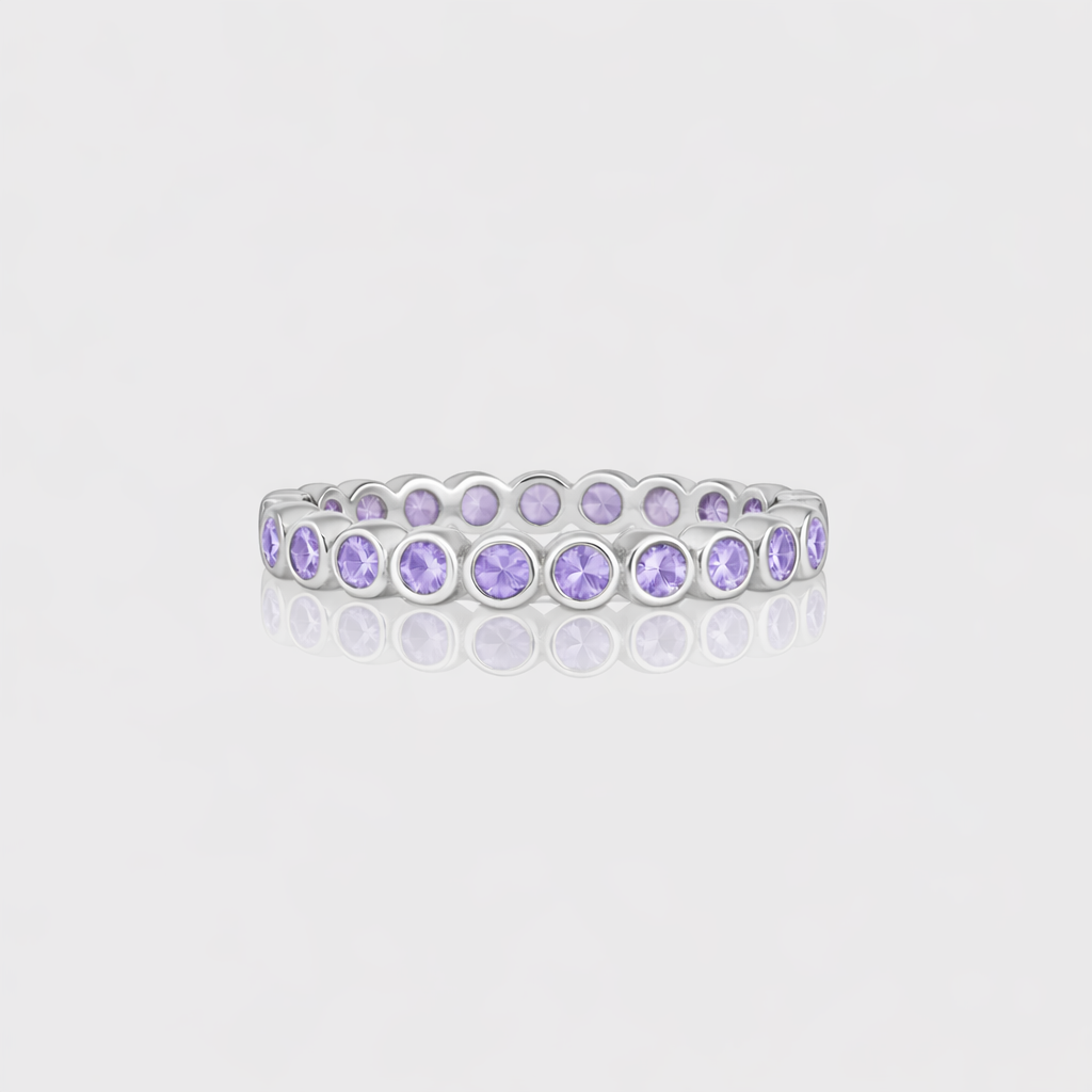 • Stones: Natural amethyst gemstones in a continuous row of bezel-set, round-cut stones for a refined yet vibrant look.